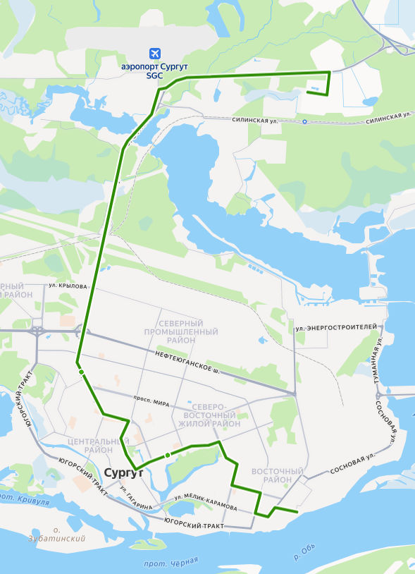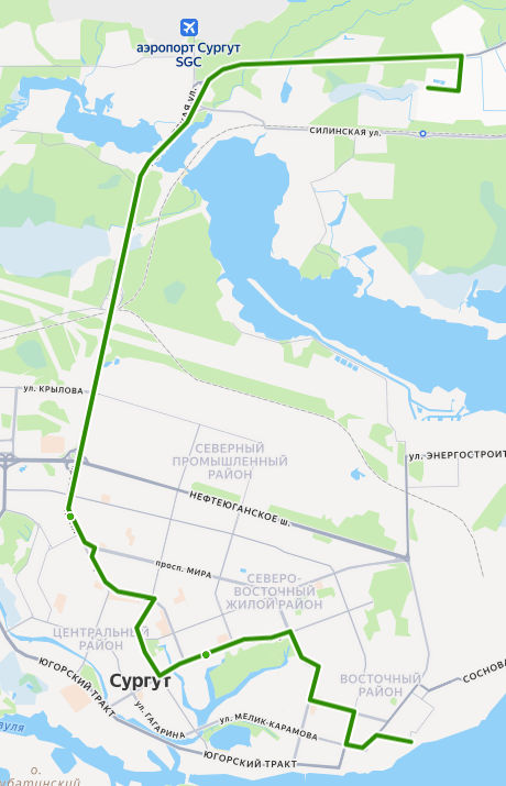 СУРГУТ, Речной вокзал → Универмаг Сургут → Рыбокомбинат → ул. Югорская → пр-т Комсомольский → Магазин Москва → ТЦ Славянский → ул. Геологическая → 24 микрорайон → Центр охраны материнства и детства → Парк За Саймой → Храм Георгия Победоносца → 20 А микрорайон → ул. Юности → пр-т Ленина → Дом Советов → Оптика → Агентство воздушных сообщений → ул. Бахилова → Кинотеатр Аврора → УБР → Автовокзал → УТТ-1 → МК-114 → 5 километр → пос. Таежный → СТ Берендей 38 → СОТ Рябинушка → СОТ Ветеран, ост. 1 → СОТ ВЕТЕРАН, Конечная
