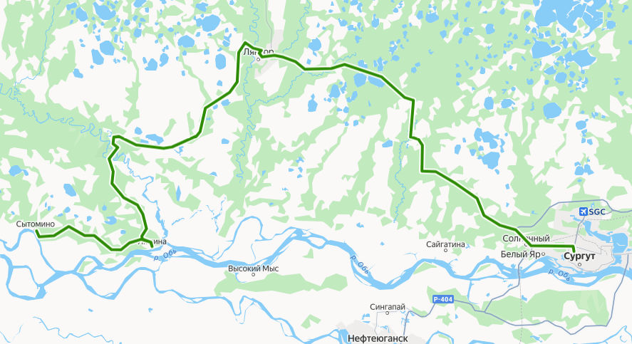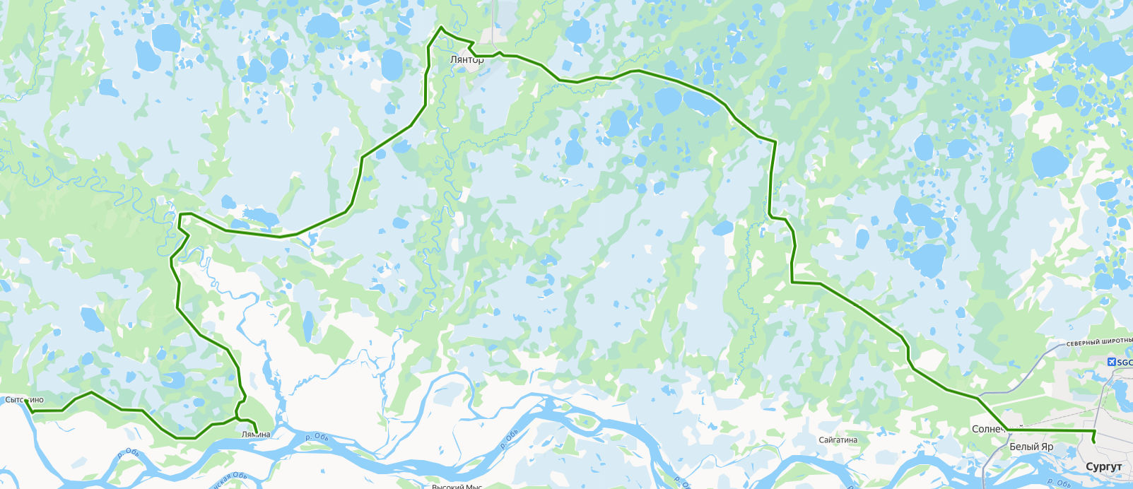 СУРГУТ, УБР → ТРЦ Аура → поворот на Белый Яр → поворот на Юность → поворот на Солнечный → ЛЯНТОР, Автостанция → Песчаный → дер. Лямина → Сытомино, ул. Набережная → ул. Совхозная → Детский сад → Администрация → СЫТОМИНО, ул. Комсомольская