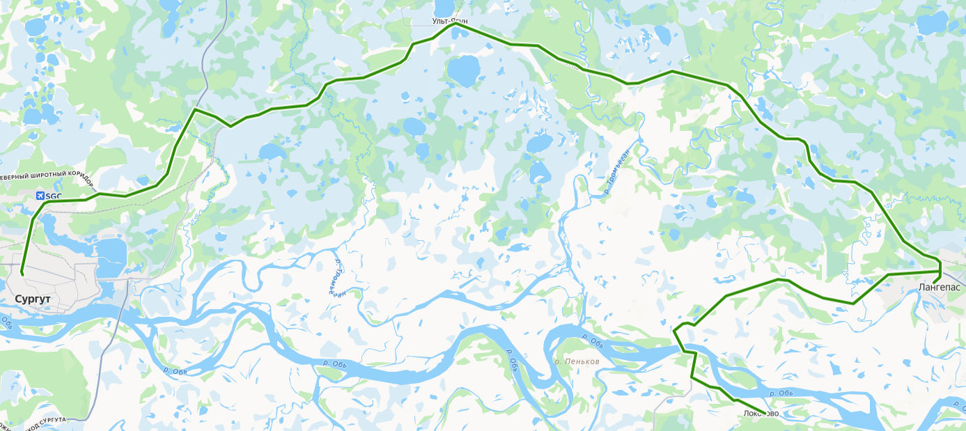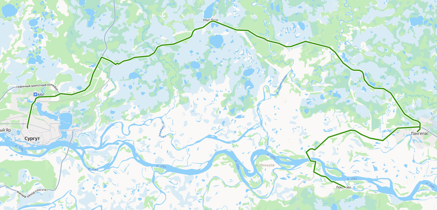 СУРГУТ, УБР → поворот на Ульт-Ягун → разъезд Чумпас → ЛАНГЕПАС, Автостанция → ЛОКОСОВО, ул. Центральная