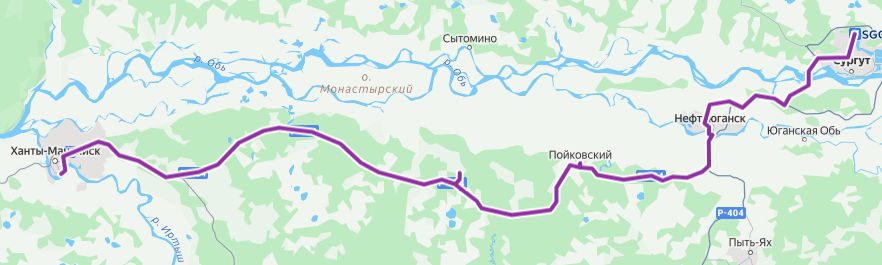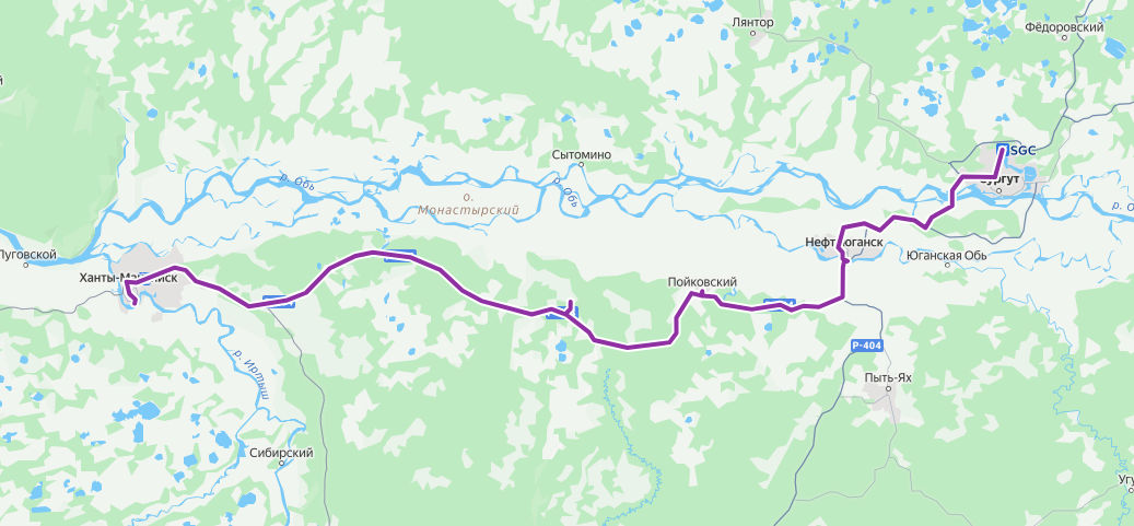 СУРГУТ, Аэропорт → ТРЦ Аура → Сингапай → НЕФТЕЮГАНСК, Автостанция → Пойковский поворот, Кафе Светлана → ПОЙКОВСКИЙ, Автостанция → Лемпино → Приразломное месторождение → Приобское месторождение → поворот на Ярки → ХАНТЫ-МАНСИЙСК, Автовокзал