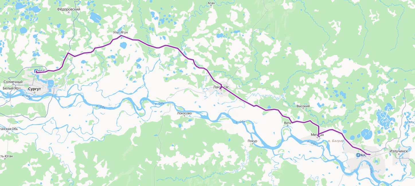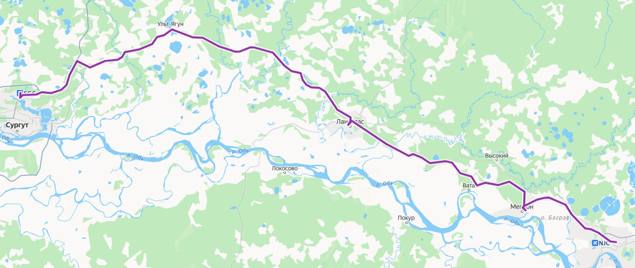 НИЖНЕВАРТОВСК, Автовокзал → МЕГИОН, Автовокзал → поворот на Высокий → поворот на Вату → ЛАНГЕПАС, Автостанция → разъезд Чумпас → поворот на Ульт-Ягун → СУРГУТ, Аэропорт