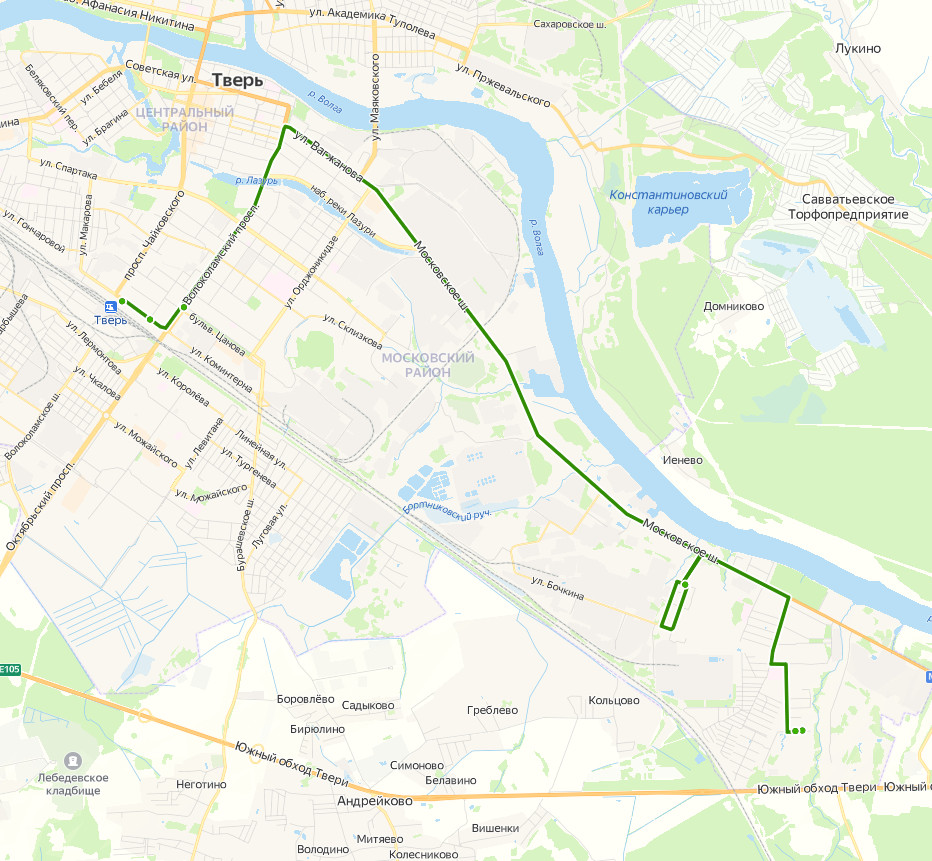 ОРЕХОВАЯ улица → Рябиновый переулок → ЦРБ → Березовая роща → Бизнес-сервис → Элеватор → ПМК 2 → пос. Элеватор → Школа → Диэлектрические кабельные системы → Автосалон → Малые Перемерки → Промзона Лазурная → Промопост → Школа → Большие Перемерки → ЦРМ → Гавань → Сибур, ПЭТФ → Гипермаркет Лента → площадь Гагарина → ДОМ СОЮЗОВ → Дом Радио → Смоленский переулок → Колледж Коняева → Театр Кукол → ул. Склизкова → ул. Фадеева → Автовокзал → ЖЕЛЕЗНОДОРОЖНЫЙ ВОКЗАЛ