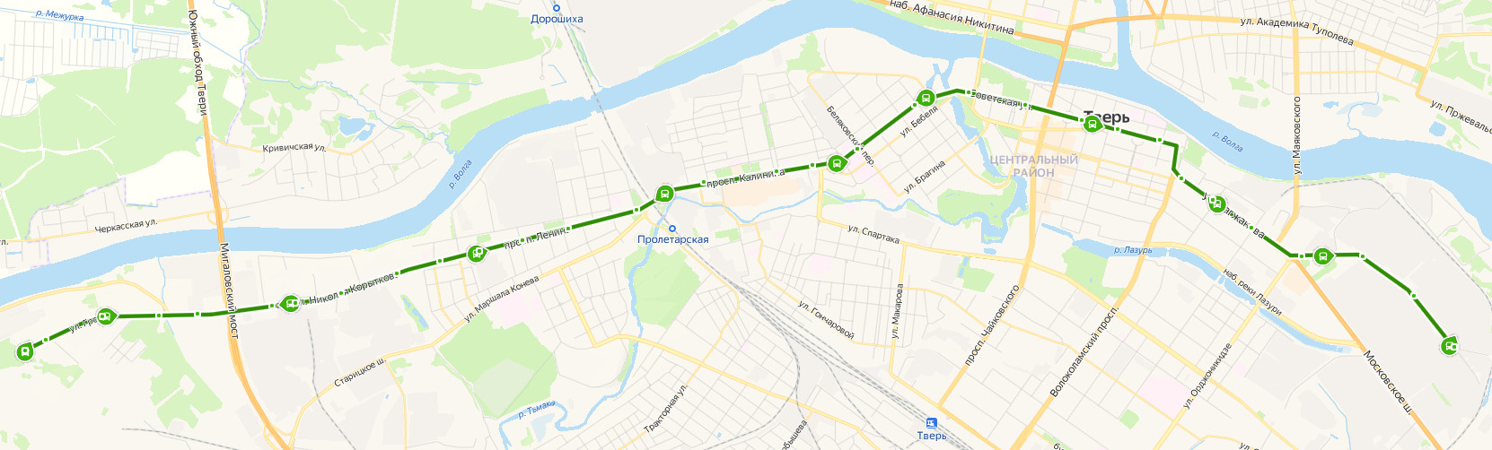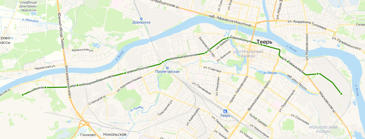 МИГАЛОВО, Конечная → Мигалово → Школа 19 → ул. Громова → Суворовское училище → Полиграфкомбинат детской литературы → Завод железобетонных изделий → Автобаза → НПО Центр программных систем → 1 Республиканская улица → Полиграфический комбинат → ул. Чайкиной → Технический университет → Комсомольская площадь → Пролетарка → бульвар Ногина → проспект Калинина → Центр Аваева → площадь Победы → Соборная площадь → Библиотека Горького → площадь Ленина → площадь Тверского → Московская площадь → Смоленский переулок → Дом Радио → Дом Союзов → площадь Гагарина → Экскаваторный завод → 2 проходная → ЭНЕРГОРЕМОНТ