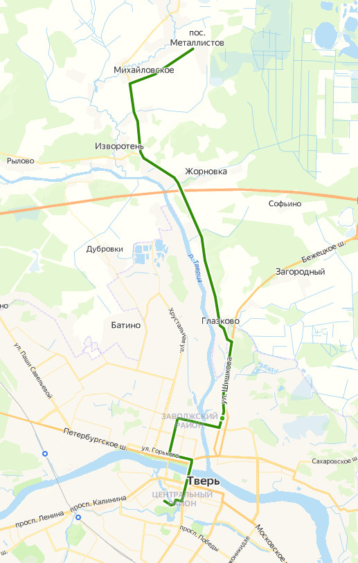 ТВЕРЬ, Центральный рынок → Тверской областной суд → площадь Тверская → пр-т Тверской → Речной вокзал → ул. Зинаиды Коноплянниковой → ул. Мусоргского → б-р Шмидта → Школа 17 → ул. Красина → пер. Третьяковский → Исаевский ручей → Автобусный парк → ул. Шишкова, д.98-а → ДРСУ → поворот на Глазково → Глазково, ост. 1 → Глазково, ост. 2 → поворот на Аэропорт → Долматово, ост. 1 → Долматово, ост. 2 → Жорновка → СНТ Околица → Железнодорожный переезд → Стрельниково → Михайловское → Яковлево → пос. МЕТАЛЛИСТОВ