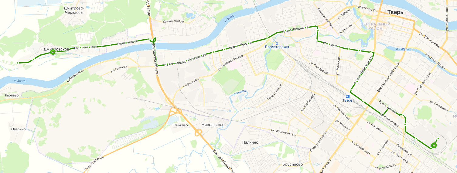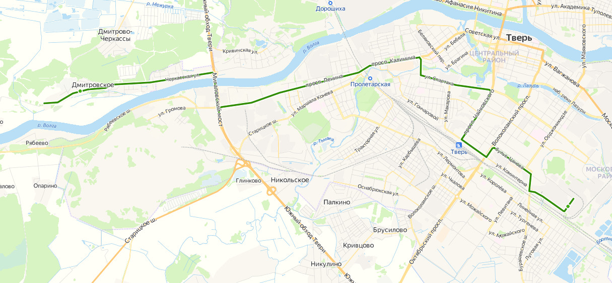 ТВЕРЬ, 109 ветка → Мясокомбинат → Холдинг Афанасий → б-р Цанова → Автовокзал → Железнодорожный вокзал → пер. Спортивный → ул. Склизкова → пл. Капошвара → Дворец молодежи → ул. Тимирязева → Фабрика Вагжанова → Рождественские горки → Христорождественский монастырь → пр-т Калинина → б-р Ногина → Пролетарка → пл. Комсомольская → Технический университет → ул. Лизы Чайкиной → Полиграфический комбинат → ул. 1 Республиканская → НПО Центр программных систем → Автобаза → Завод железобетонных изделий → Полиграфкомбинат детской литературы → Черкассы → ул. Черкасская, д. 95 → пер. Курганный → ул. Черкасская, д. 124 → пер. Цветочный → пер. Норильский → ул. Северная → Дмитровское → ДМИТРОВСКОЕ, д. 72