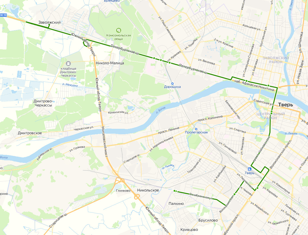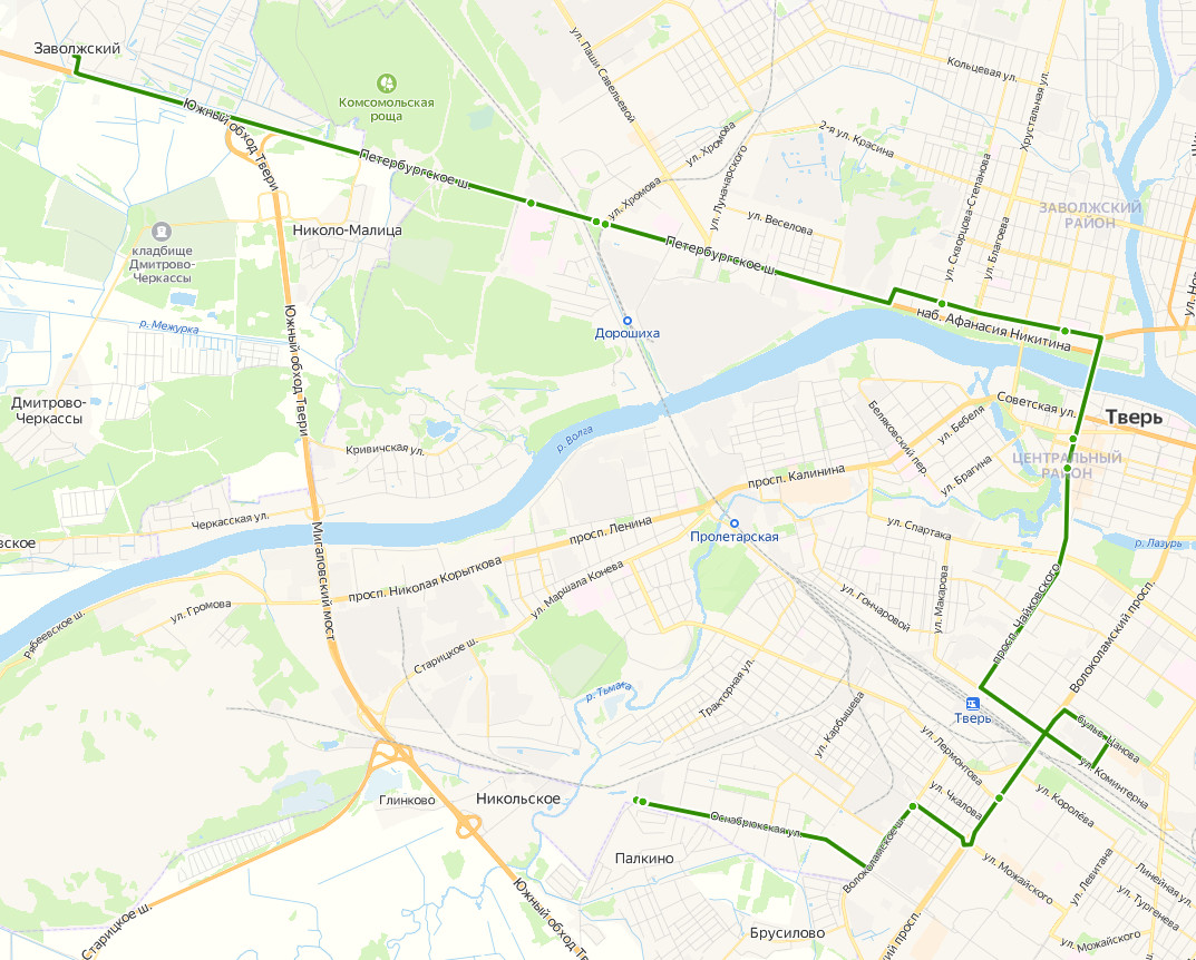 ТВЕРЬ, Мамулино → Поликлиника → Почта → Спорткомплекс → Мамулино, ост. 2 → Брусилово → ш. Волоколамское → Сельхозтехника → пос. Чкалова → пр-т Октябрьский → б-р Цанова, д.2 → ул. Коминтерна → Автовокзал → Железнодорожный вокзал → пер. Спортивный → ул. Склизкова → пл. Капошвара → Гимназия 12 → пр-т Тверской → Речной вокзал → ул. Зинаиды Коноплянниковой → пл. Мира → Областной архив → ул. Скворцова-Степанова → Петербургская застава → 3 городская больница → ул. Комарова → Вагоностроительный завод → 1 медсанчасть → ДСК → Областная больница → Спортбаза → Отель Тверь → СНТ Лесник → Заволжский, ост. 1 → ЗАВОЛЖСКИЙ