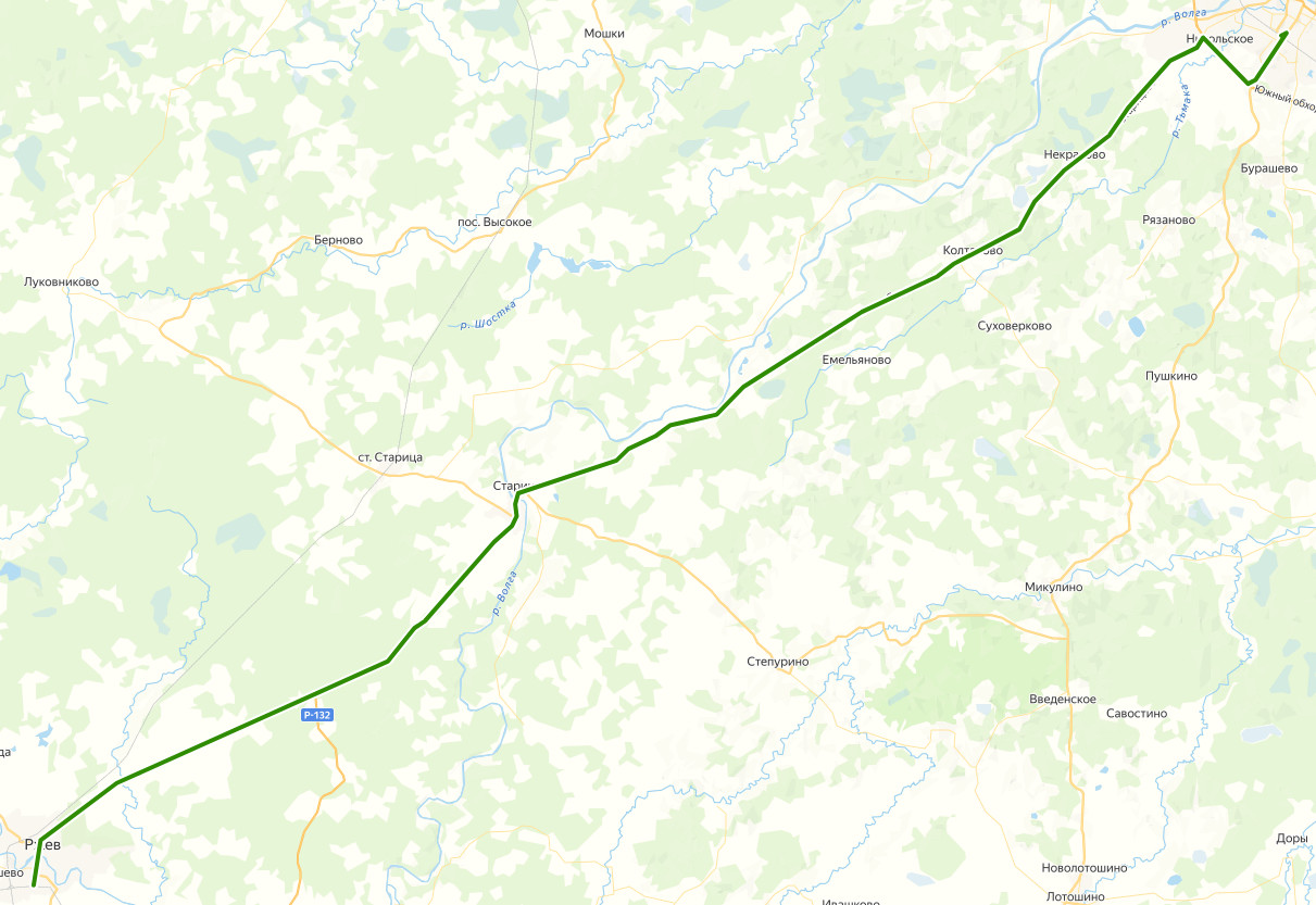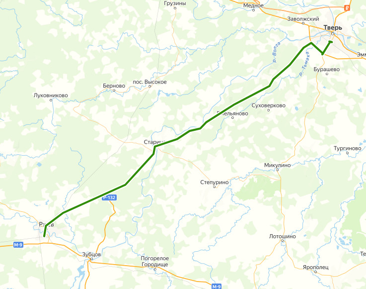 ТВЕРЬ, Автовокзал → Калиново → Некрасово → Красная Гора → Борисково → Колталово → Зуево → Шебаршино → Кунилово → Левашово → Иванищи → Улитино → Свистуново → Нижний Спасс → Саначино → Старица, Автостанция → ул. Адмирала Корнилова → Кинотеатр → Полиция → Вяхирево → Иванково → поворот на Молоково → Кореничено → поворот на Савельево → поворот на Мартьяново → поворот на Зубцов → Плешки, ост. 2 → Плешки, ост. 1 → Успенское → Бойня → Сады, ост. 2 → Сады, ост. 1 → СПТУ → ул. Котовского → Новый рынок → ул. Бехтерева → ул. Партизанская → ул. Калинина → ул. Максима Горького → пл. Мира → ул. Железнодорожная → РЖЕВ, Автовокзал