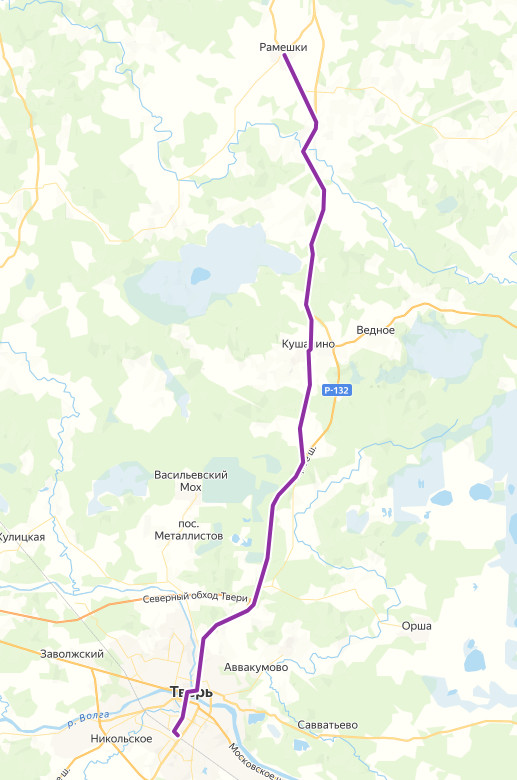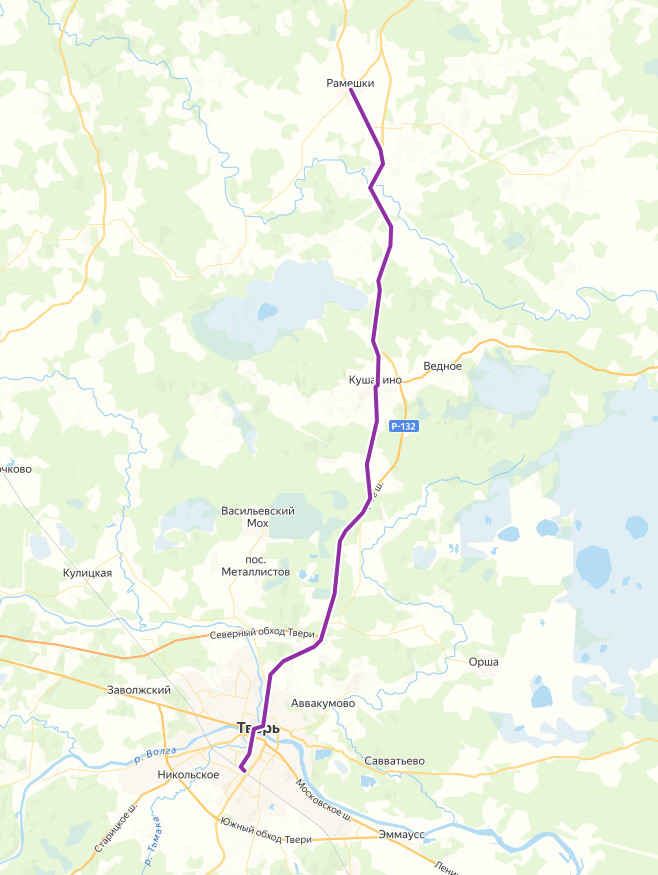 ТВЕРЬ, Автовокзал → Речной вокзал → Исаевский ручей → Автобусный парк → ул. Шишкова, д.98а → ДРСУ → поворот на Глазково → Змеёво → Загородный, ост. 1 → Загородный, ост. 2 → Баламутово → поворот на Александровку → СНТ Тверь → Белая дорога → СНТ Звезда → СНТ Ольховая → 17 километр → Арининское → Симоново → Рождество → Кушалино, Автостанция → поворот на Тихорево → Хохловка → Минино → Застолбье → Летнево → Коптино → Заря → Городковский → Ошвино → Прудово → Ильино → Селище → Школа → РАМЕШКИ, ул. Советская
