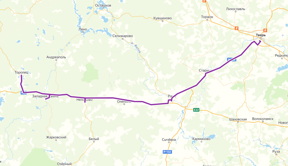 ТВЕРЬ, Касса Автоэкспресс → Калиново → Некрасово → Красная Гора → Борисково → Колталово → Зуево → Шебаршино → Кунилово → Левашово → Иванищи → Улитино → Свистуново → Нижний Спасс → Саначино → Старица, Автостанция → Кинотеатр → Полиция → Вяхирево → Иванково → поворот на Молоково → Кореничено → поворот на Савельево → поворот на Мартьяново → поворот на Зубцов → Плешки, ост. 2 → Плешки, ост. 1 → Успенское → Бойня → Сады, ост. 2 → Сады, ост. 1 → СПТУ → ул. Котовского → Новый рынок → ул. Бехтерева → ул. Партизанская → ул. Калинина → ул. Максима Горького → ул. Железнодорожная → Ржев, Автовокзал → Толстиково → поворот на Есинку → Мончалово → Звягино → Свистуны → Чертолино → Барыгино → поворот на Никулино → поворот на Ладыгино → Соболево → Климовка → Сады → поворот на Оленино → Бобровка → Горбуны → Лезвино → Луни → поворот на Мирный → поворот на Вяземку → Сады → Шахта 11 → Шахта 7 → поворот на Нелидово → ГНС → Котельная → Шахта 2 → Нелидово, Касса Автоэкспресс → Новое Кутьево → Сады → Сады → поворот на Земцы → Ефремово → Лейкино → Дорофеево → поворот на Пено → поворот на Западную Двину → Велеса → пер. Комсомольский → пер. Речной → ул. Комсомольская → Школа 2 → Западная Двина, Автовокзал → Велеса → поворот на Западную Двину → поворот на Лаврово → Ново-Ивановское → Соломкино → Белица → поворот на М-9 → Рясно → Октябрьский → Красный Вал → ТОРОПЕЦ, Касса Автоэкспресс