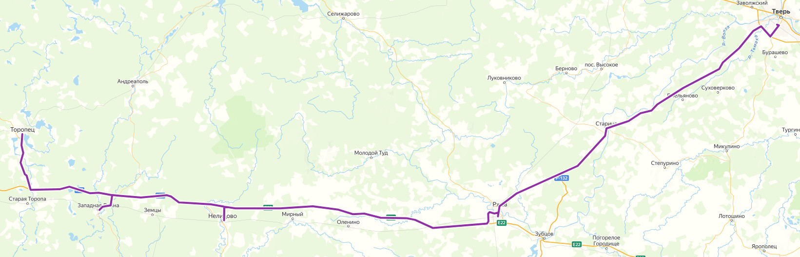 ТОРОПЕЦ, Касса Автоэкспресс → Лохово → Речане → поворот на Лесную → Чихачи → Октябрьский → Рясно → поворот на М-9 → Белица → Соломкино → Ново-Ивановское → поворот на Лаврово → поворот на Западную Двину → Велеса → Комсомольский переулок → Речной переулок → Комсомольская улица → Школа 2 → Западная Двина, Автовокзал → Велеса → поворот на Западную Двину → поворот на Пено → Дорофеево → Лейкино → Ефремово → поворот на Земцы → Сады → Сады → Новое Кутьево → поворот на Нелидово → Нелидово, Касса Автоэкспресс → поворот на Нелидово → Шахта 7 → Шахта 11 → Сады → поворот на Вяземку → поворот на Мирный → Луни → Лезвино → Горбуны → Бобровка → поворот на Оленино → Сады → Климовка → Соболево → поворот на Ладыгино → поворот на Никулино → Барыгино → Чертолино → Свистуны → Звягино → Мончалово → поворот на Есинку → Толстиково → ул. Горького → Железнодорожная улица → Ржев, Автовокзал → Ржев, Новый рынок, Касса Автоэкспресс → ул. Котовского → Сады, ост. 1 → Сады, ост. 2 → Бойня → Успенское → Плешки, ост. 1 → Плешки, ост. 2 → поворот на Зубцов → поворот на Мартьяново → поворот на Савельево → Кореничено → поворот на Молоково → Иванково → Вяхирево → Полиция → Кинотеатр → Старица, Автостанция → Саначино → Нижний Спасс → Свистуново → Улитино → Иванищи → Левашово → Кунилово → Шебаршино → Зуево → Колталово → Борисково → Красная Гора → Некрасово → Калиново → Тверь, Автовокзал → ТВЕРЬ, Касса Автоэкспресс