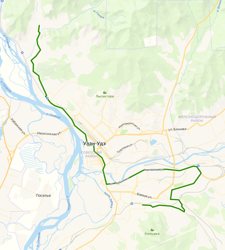 микрорайон НОВАЯ КОМУШКА → Чудская улица → Барнаульская улица → Тэнгэри → Полковая улица → Воинская часть → Тепловая улица → АЗС Витлас → 44 квартал → Женская консультация → 43 квартал → Призывной пункт → 41 квартал → Акбэс → Кафе Жили-были → Техникум → Мелькомбинат → Рынок Крестьянский → 20-а квартал → Форд центр → Товары Бурятии → Технологический университет → 10 корпус ВСГУТУ → Юношеская библиотека → Эльдорадо → ул. Лебедева → Авторынок → Сельскохозяйственный техникум → ул. Трубачеева → ул. Бабушкина → Центральный рынок → проспект Победы → площадь Советов → Виадук → ул. Борсоева → ТД Наран → Завод Эмальпосуда → Завод Электромашина → Проходная завода Электромашина → Стекольный завод → Железнодорожный переезд → СНТ Стекольщик → Городское кладбище → АЗС → 1 участок → ДК Вагжанова → База → 2 участок → станция Дивизионная → Дивизионная улица → 3 УЧАСТОК