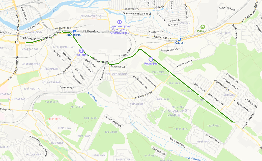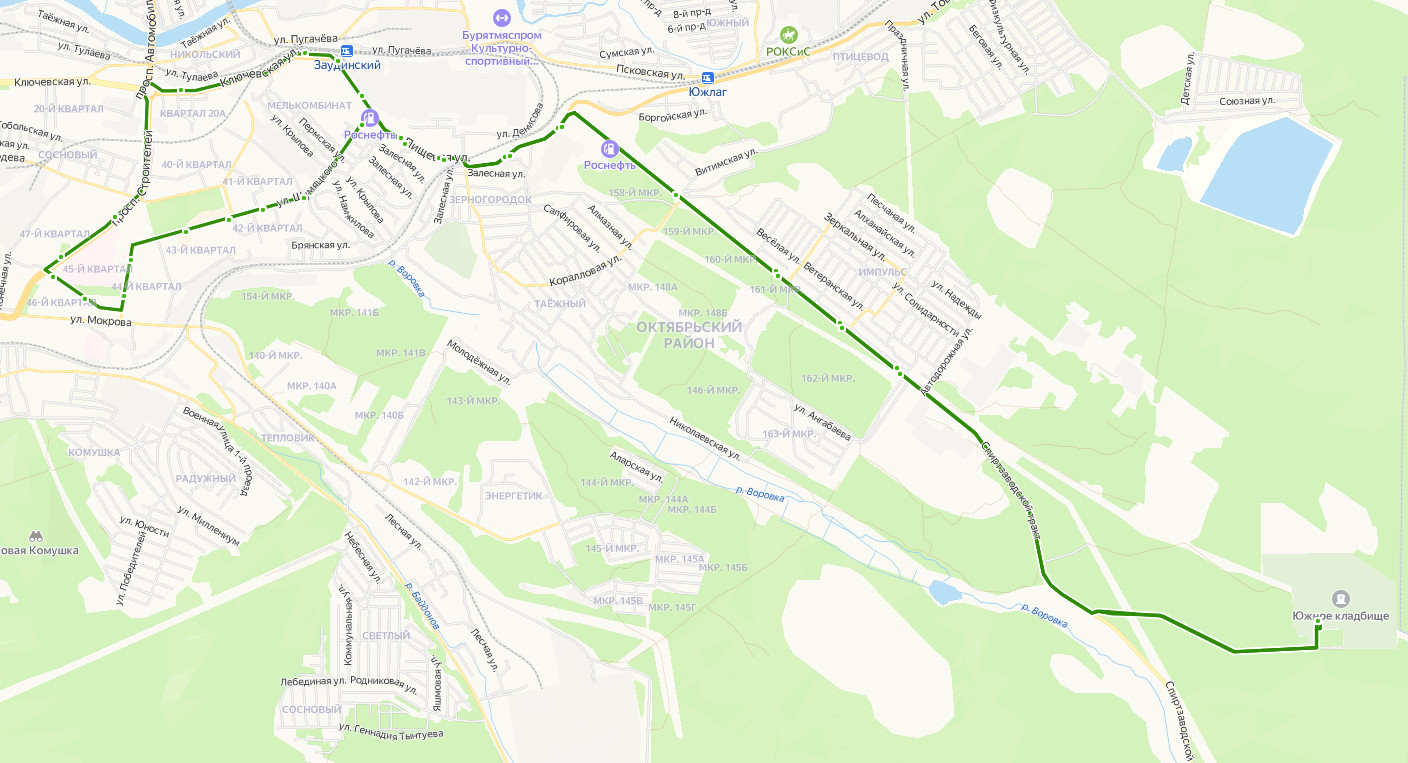 ЮЖНОЕ КЛАДБИЩЕ → ПОЖАРНАЯ ЧАСТЬ → Ветеранская улица → 2 километр → Подстанция → Залесная улица → Пищевая улица → ТЦ Надежда → Техникум → Мелькомбинат → Рынок Крестьянский → 20 А КВАРТАЛ