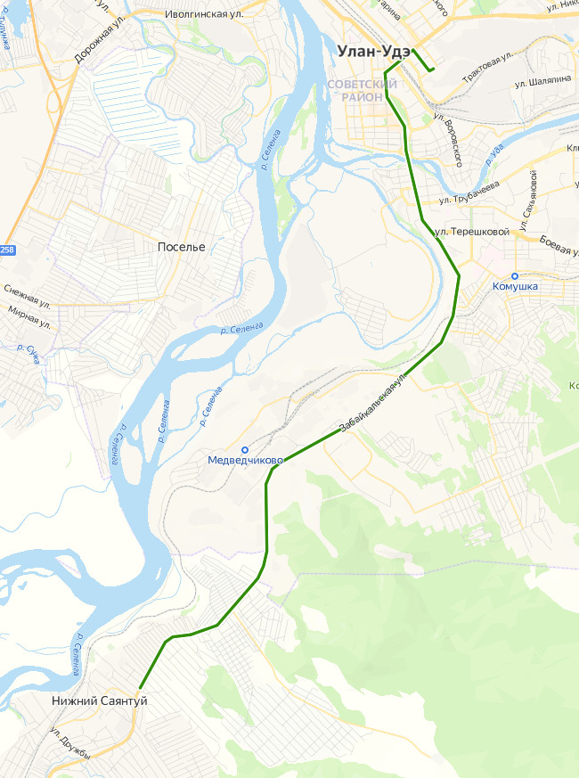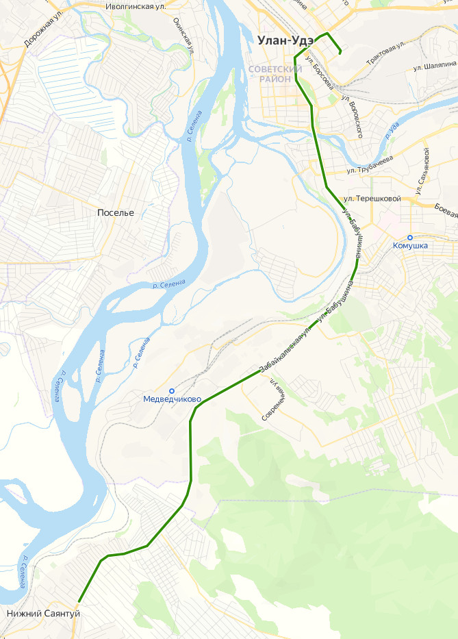 МЕДИЦИНСКИЙ ЦЕНТР ДИАГРУПП → Элеватор → ул. Советская → Мемориал Победы → ТЦ Еврозона → Центральный рынок → ул. Бабушкина → ул. Геологическая → Телецентр → Прямая → ТЦ Абсолют → Мемориал Память → Завод ЖБИ 1 → АЗС → мкр. Силикатный → СМУ 4 → по требованию → Дачи → ДНТ Селенга → по требованию → по требованию → ВАХМИСТРОВО