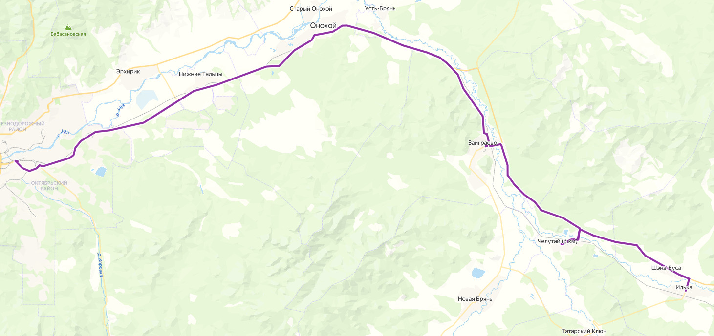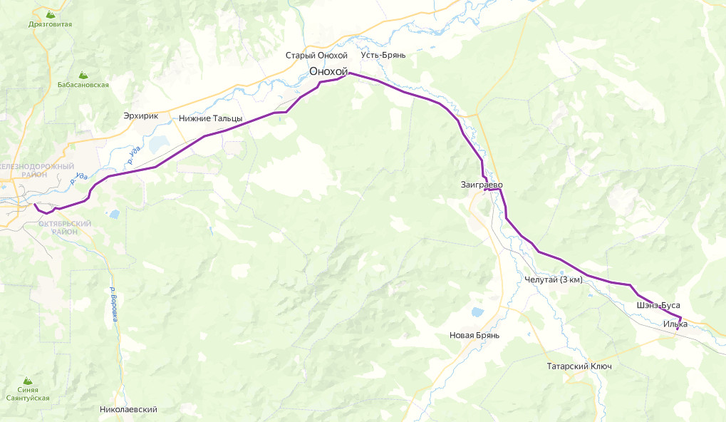 ИЛЬКА → Шэнэ-Буса → Челутай, трасса → СНТ Весна → Заиграево → ЗАИГРАЕВО, Автовокзал → 5690 километр → СНТ Локомотив → Блок-пост Серова → Школа → Онохой → станция Онохой → Кладбище → СНТ Заозерный → поворот на Звездный → Нижние Тальцы → 5 километр → АЗС → ДНТ Бытовик → СНТ Светлана → 3 километр → 2 километр → 1 километр → 0 км Заиграевского тракта → СНТ Солнечный → Тальцы, ост. 2 → Лесобаза → станция Тальцы → Медпункт → Хозяйственная часть → Товарный двор → пос. Южный, ост. 3 → Кафе Березка → пос. Южный, ост. 2 → ТЦ Абсолют → пос. Южный, ост. 1 → Подстанция → Залесная улица → Пищевая улица → ТЦ Надежда → Техникум → УЛАН-УДЭ, Мелькомбинат, Автокасса