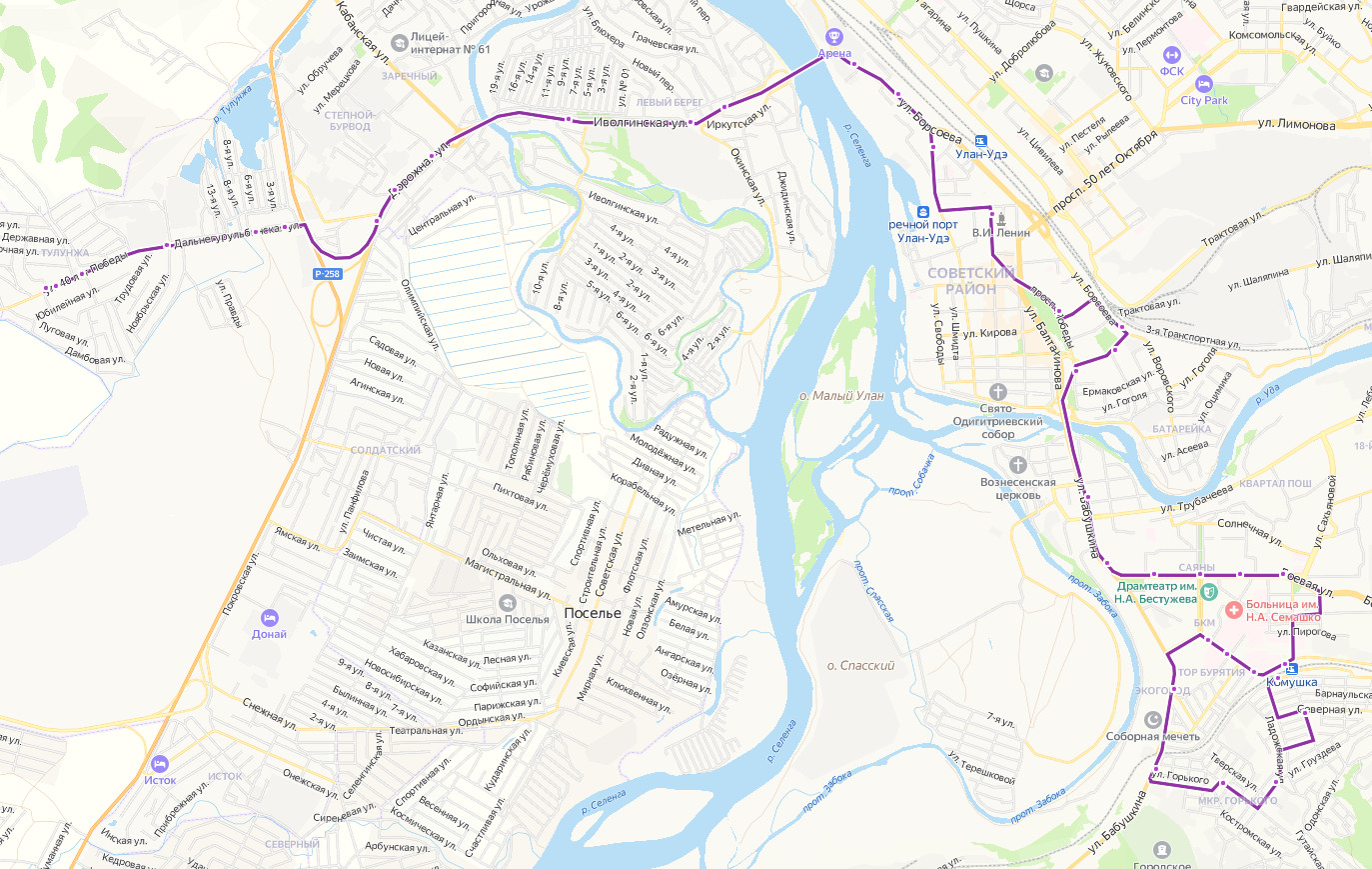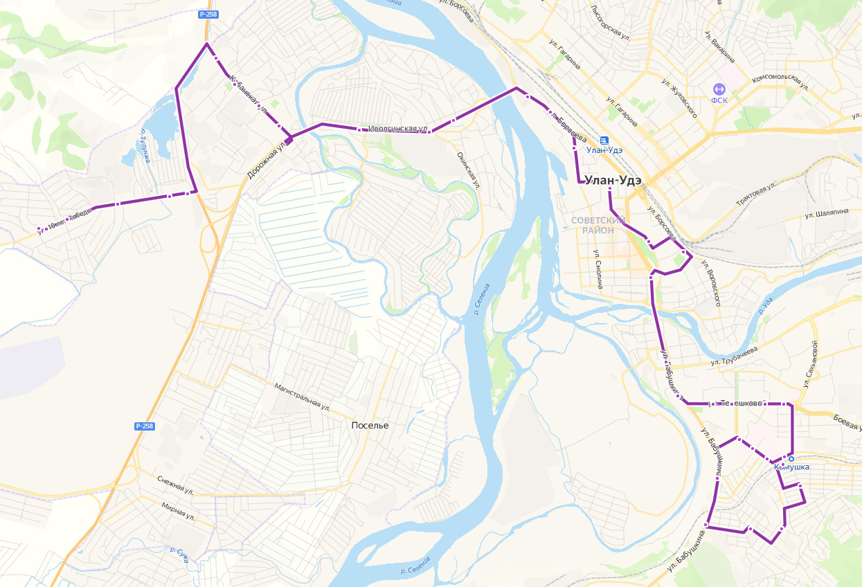 микрорайон ТУЛУНЖА → Стадион → мкр. Тулунжа, верхняя → Автоцентр Камаз → мкр. Тулунжа, нижняя → Ордон → МФЦ → Бурвод → ТЦ Абсолют → КПП → 5 километр → Школа 44 → Левый берег → ТД Наран → ул. Борсоева → Виадук → площадь Советов → проспект Победы → Торговая площадь → Центральный рынок → ул. Бабушкина → Геологическая улица → Институт культуры → Русский драматический театр → Республиканская больница → Лицей 24 → станция Комушка → Инфекционная больница → Онкодиспансер → Солнечная башня → Прямая → ТЦ Абсолют → База Ариг Ус → пос. Горького → Раздольная улица → ДАЛЬНЕВОСТОЧНАЯ улица