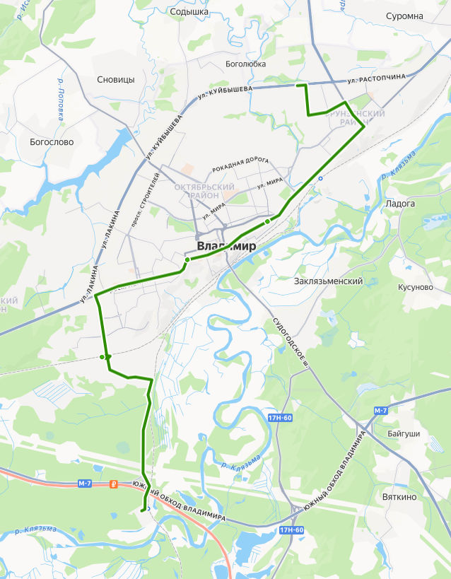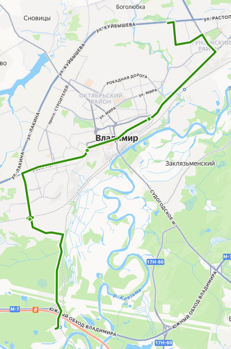МОСТОСТРОЙ → Южные сады → Сады Связист → ул. Шпалорезка → по требованию → Энергомаш → Рынок Флора → Завод ЖБИ → ул. Фатьянова → Рынок Слобода → Парк Дружба → ул. Верхняя Дуброва → проспект Ленина → ул. Пугачева → площадь Победы → Левитановский сквер → ул. Пичугина → Садовая площадь → Студёная Гора → Золотые Ворота → Спасская улица → Соборная площадь → Гостиница Владимир → Андриановский сквер → площадь Фрунзе → Князь-Владимирское кладбище → Владимирский химический завод → ул. Погодина → Детская больница → Дом мебели → Развлекательный комплекс Русь-кино → Парк Добросельский → ул. Радищева → ул. Безыменского → Универсам → Магазин Ополье → поворот на ул. Куйбышева → ул. КУЙБЫШЕВА