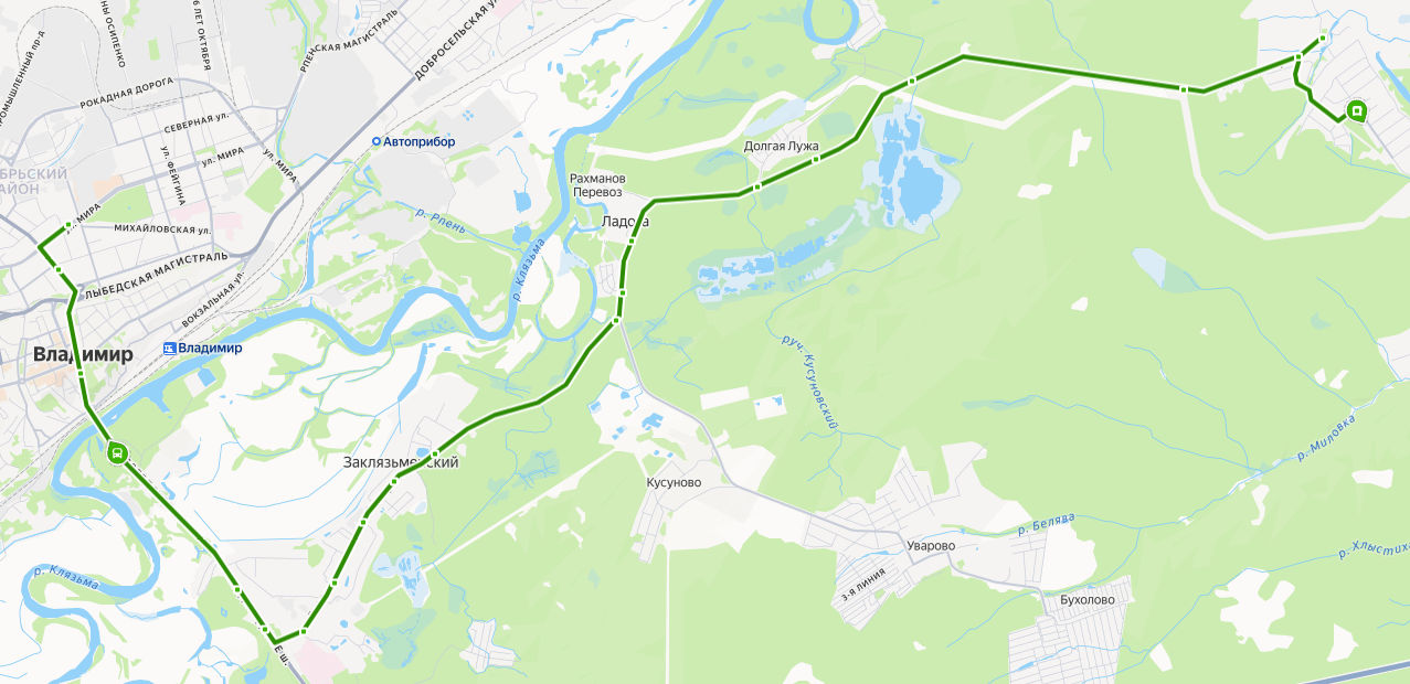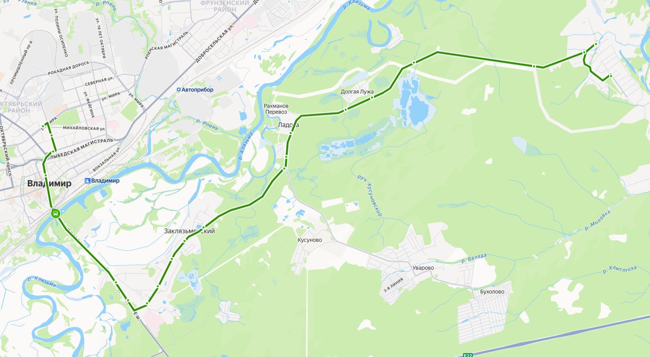 микрорайон ЛУНЕВО, ул. Журавлиха → Храм Иоакима и Анны → Ольховка → Просека → Долголужские сады → с. Долгая Лужа, ост. 2 → с. Долгая Лужа, ост. 1 → Турбаза Ладога → Жилой комплекс Ладога → поворот на Уварово → Заклязьменский → Ипподром → Ветеринарная клиника → Школа 46 → Воскресенский храм → Гостиница Клязьма → Коммунар → Ерофеевский спуск → ул. Луначарского → Центральный рынок → ул. МИРА