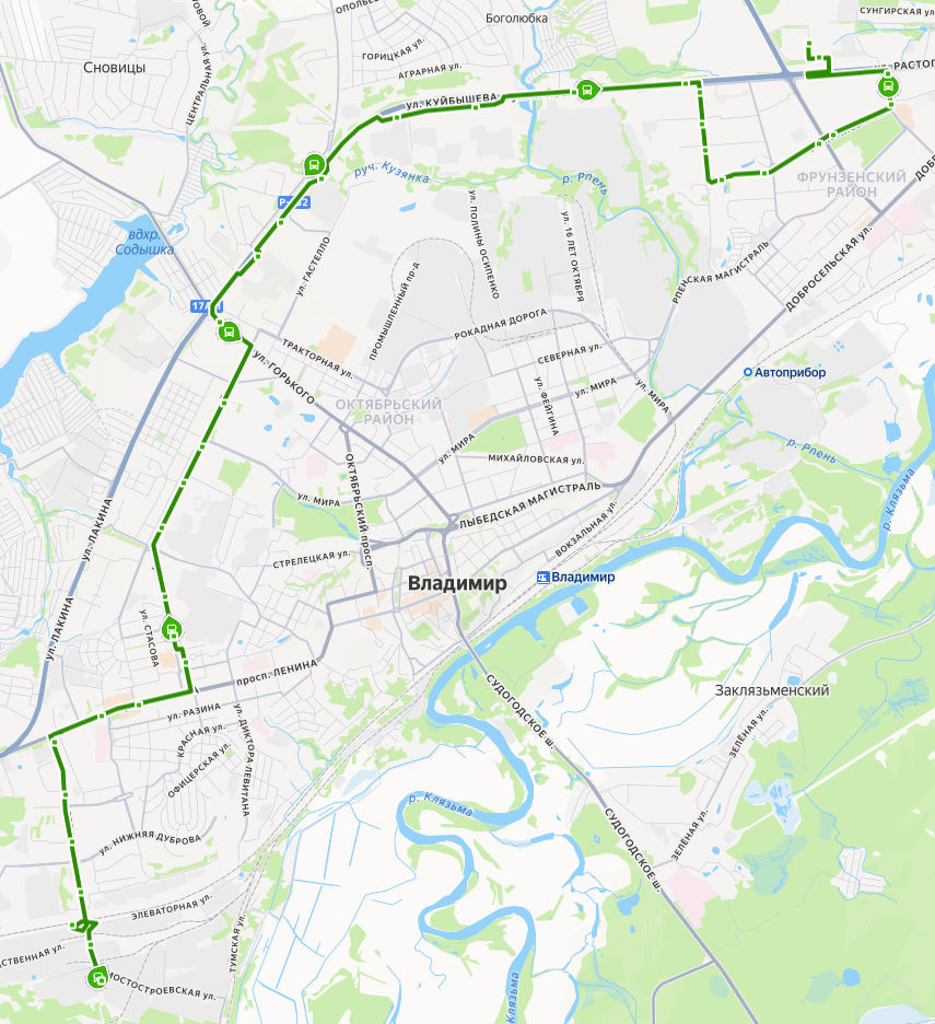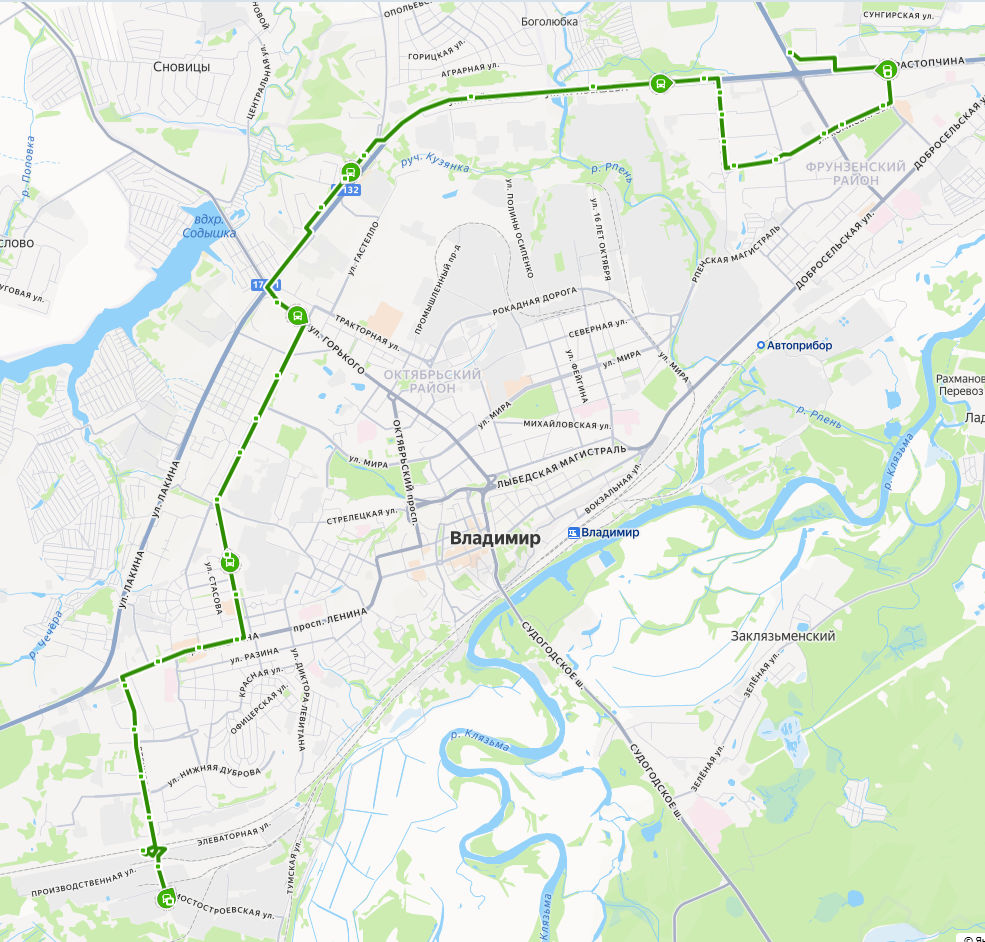 ГИПЕРМАРКЕТ ГЛОБУС → поворот на ул. Растопчина → ул. Комиссарова → Универмаг Восток → Парк Добросельский → ул. Радищева → ул. Безыменского → Универсам → Магазин Ополье → поворот на ул. Куйбышева → ул. Куйбышева → Комбинат Тепличный → Торговый комплекс Тандем → поворот на Содышку → Смоленская улица → Веризино → Река Содышка → ул. Белоконской → Марьинка → Педагогический институт → Красноармейская улица → Электросети → ул. ЧАЙКОВСКОГО → площадь Победы → ул. Пугачева → проспект Ленина → ул. Верхняя Дуброва → Парк Дружба → Рынок Слобода → ул. Фатьянова → Завод ЖБИ → Рынок Флора → МОСТОСТРОЕВСКАЯ улица