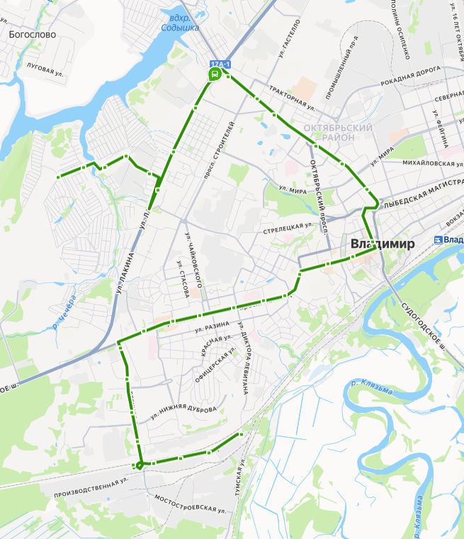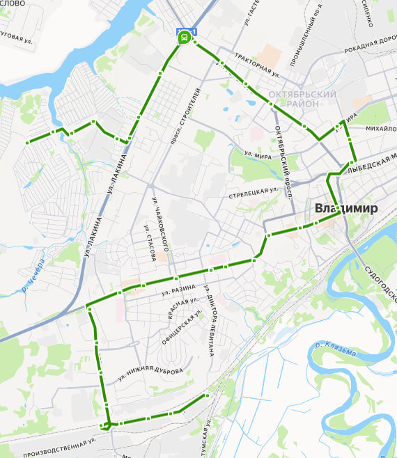 СЕЛЕЦКИЕ САДЫ → Сельцо, ост. 3 → ВЕРХНЕЕ СЕЛЬЦО, ост. 2 → Сельцо, ост. 1 → Ореховая улица → бульвар Художника Иванова → ул. Дружбы → пос. РТС → Река Содышка → ул. Гастелло → Владимирский государственный университет → площадь Ленина → Всполье → Юрьевская застава → ул. Гагарина → Спасская улица → Золотые Ворота → Студёная Гора → Садовая площадь → ул. Пичугина → Левитановский сквер → площадь Победы → ул. Пугачева → проспект Ленина → ул. Верхняя Дуброва → Парк Дружба → Рынок Слобода → ул. Фатьянова → Завод ЖБИ → Мещёрская улица → Хладокомбинат → Хлебозаводская улица → ЭЛЕВАТОРНАЯ улица