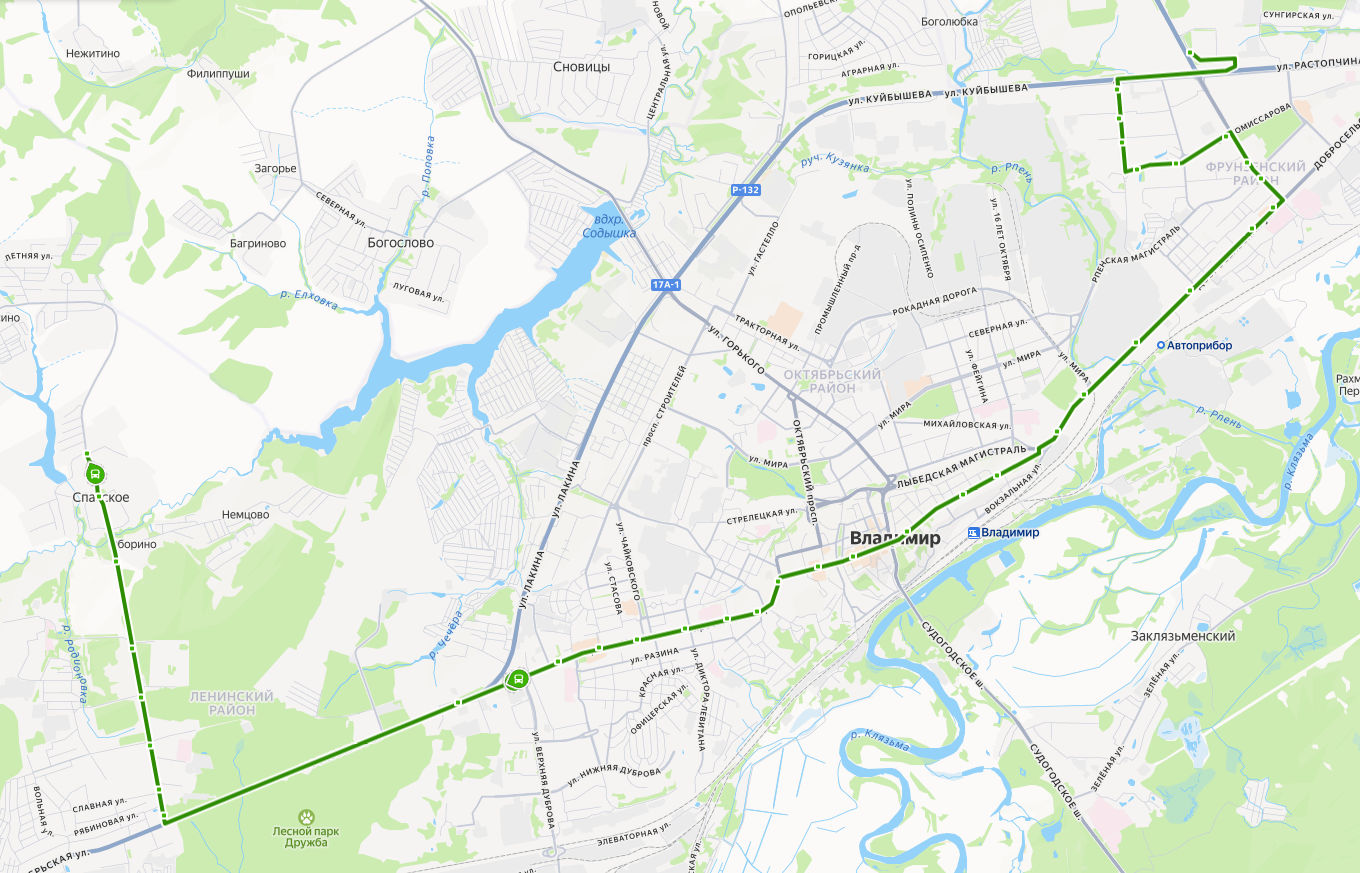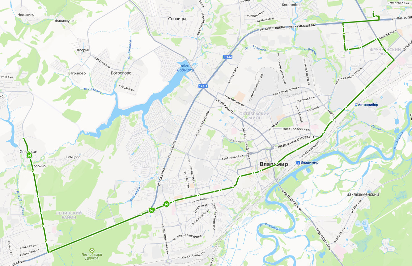 СПАССКОЕ, ул. Садовая → Никольский храм → Оборино → Институт защиты животных → поворот на Родниковую улицу → ул. Михалькова → Институтский городок → Юрьевец → ш. Московское → пр-т Ленина → ул. Пугачева → пл. Победы → Левитановский сквер → ул. Пичугина → пл. Садовая → Студёная Гора → Золотые Ворота → ул. Спасская → пл. Соборная → Гостиница Владимир → Андриановский сквер → пл. Фрунзе → Князь-Владимирское кладбище → Владимирский химический завод → ул. Дмитрия Погодина → Детская больница → Дом мебели → Развлекательный комплекс Русь-кино → Добросельский парк → ул. Радищева → ул. Безыменского → Универсам → Магазин Ополье → поворот на ул. Куйбышева → ГИПЕРМАРКЕТ ГЛОБУС