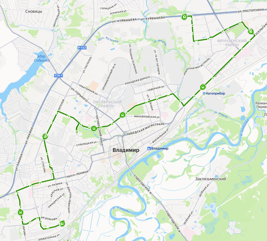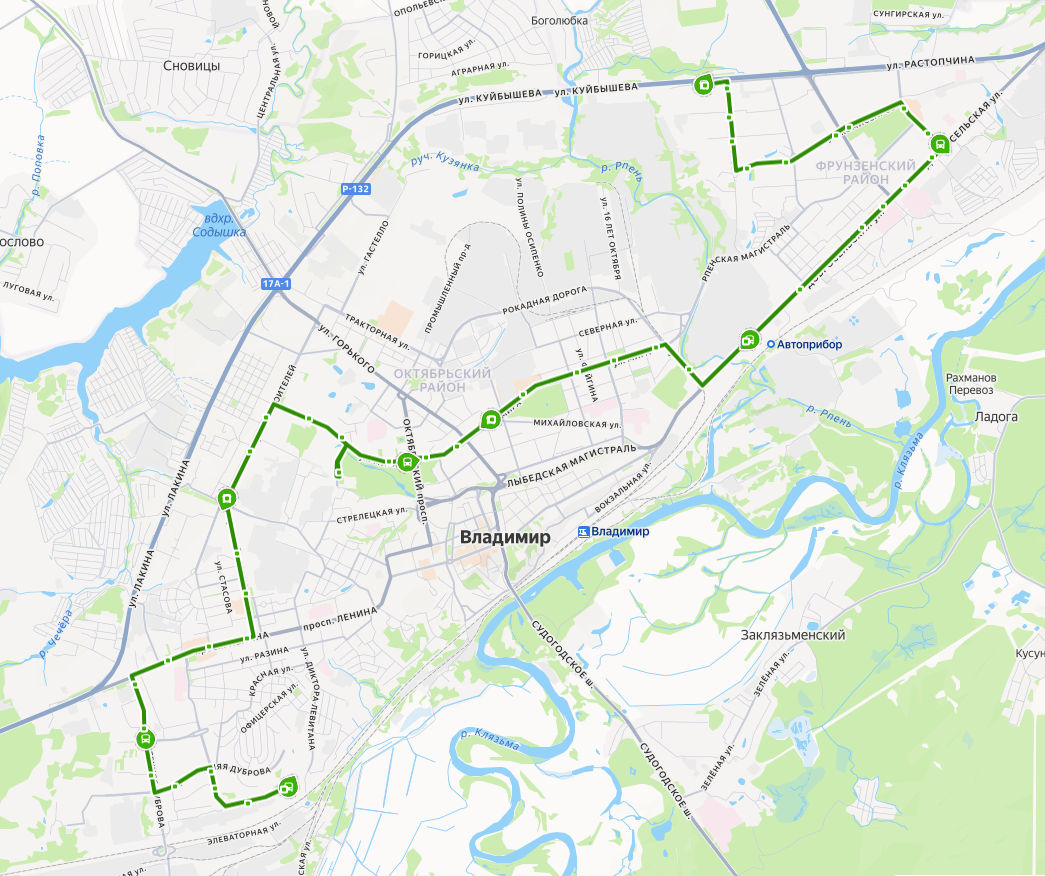 ул. КУЙБЫШЕВА → поворот на ул. Куйбышева → Магазин Ополье → Универсам → ул. Безыменского → ул. Радищева → Добросельский парк → Универмаг Восток → ул. Комиссарова → ул. Егорова → Сады на Добросельской → Городская больница 5 → Суздальский проспект → Детская больница → ул. Погодина → Владимирский химический завод → Князь-Владимирское кладбище → Плавательный бассейн → Дом культуры молодежи → ул. Осипенко → Рынок Ополье → ул. Мира → Музей природы → Октябрьский проспект → Родник → Дворец творчества юных → поворот на ДТЮ → Студенческий городок → Марьинка → Педагогический институт → Красноармейская улица → Электросети → ул. Чайковского → площадь Победы → ул. Пугачева → проспект Ленина → ул. Верхняя Дуброва → Парк Дружба → Рынок Слобода → ул. Нижняя Дуброва → ул. Тихонравова → Финансовый университет → Детский сад 12 → ЮГО-ЗАПАДНАЯ