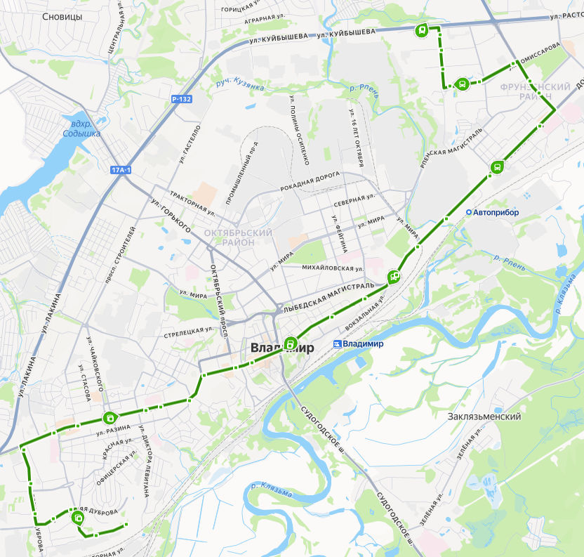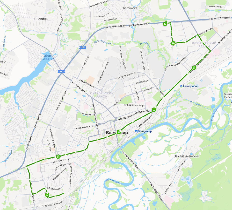 ул. КУЙБЫШЕВА → поворот на ул. Куйбышева → Магазин Ополье → Универсам → ул. Безыменского → ул. Радищева → Добросельский парк → Развлекательный комплекс Русь-кино → Дом мебели → Суздальский проспект → Детская больница → ул. Погодина → Владимирский химический завод → Князь-Владимирское кладбище → площадь Фрунзе → Спортшкола → Гостиница Владимир → Соборная площадь → Спасская улица → Золотые Ворота → Студёная Гора → Садовая площадь → ул. Пичугина → Левитановский сквер → площадь Победы → ул. Пугачева → проспект Ленина → ул. Верхняя Дуброва → Парк Дружба → Рынок Слобода → ул. Нижняя Дуброва → ул. Тихонравова → Финансовый университет → Детский сад 12 → ЮГО-ЗАПАДНАЯ