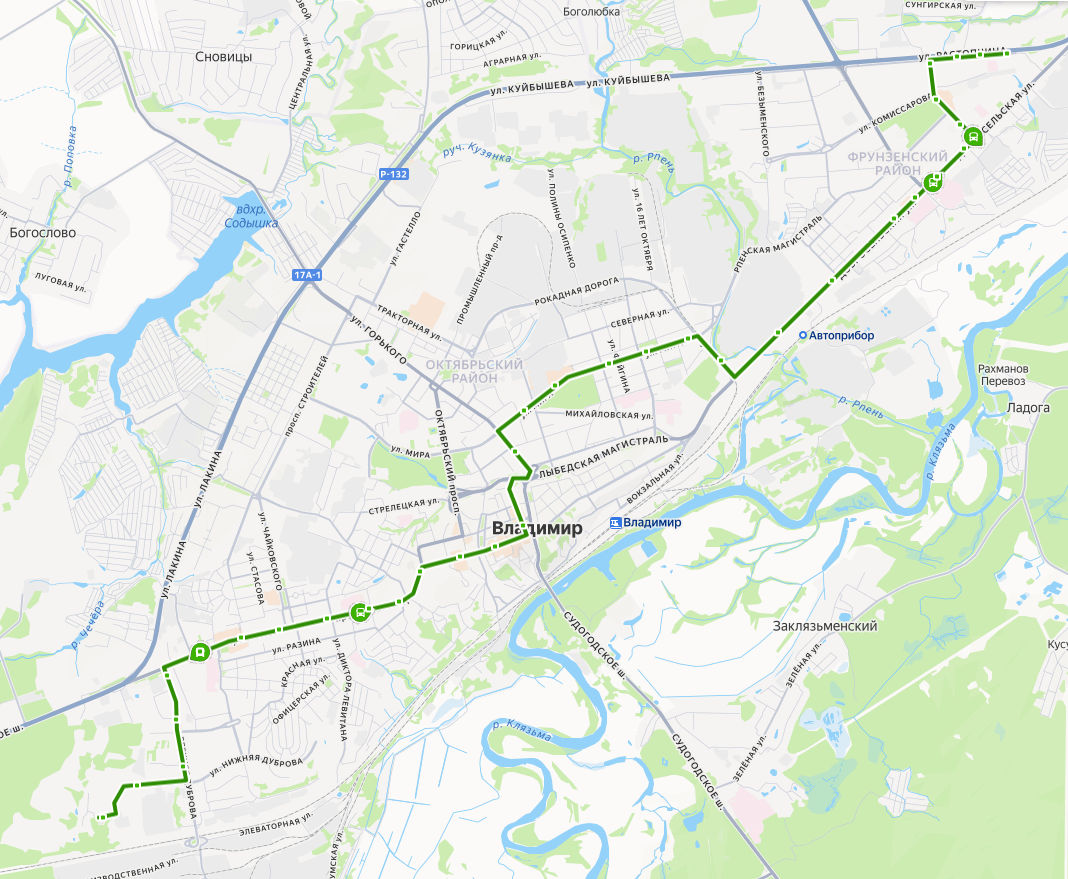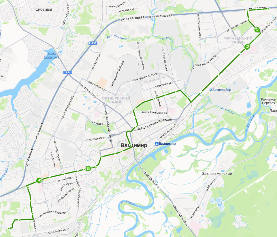 ул. СОВХОЗ ВЫШКА → Парковая → Рынок Слобода → Парк Дружба → ул. Верхняя Дуброва → пр-т Ленина → ул. Пугачева → пл. Победы → Левитановский сквер → ул. Пичугина → пл. Садовая → Студёная Гора → Золотые Ворота → ул. Спасская → ул. Гагарина → ул. Луночарского → Центральный рынок → Центральный парк → ул. Полины Осипенко → Дом культуры молодежи → Плавательный бассейн → Князь-Владимирское кладбище → Владимирский химический завод → ул. Дмитрия Погодина → Детская больница → Городская больница 5 → Сады на Добросельской → ул. Егорова → ул. Комиссарова → поворот на ул. Растопчина → Магазин Владимирец → Школа 5 → ул. РАСТОПЧИНА