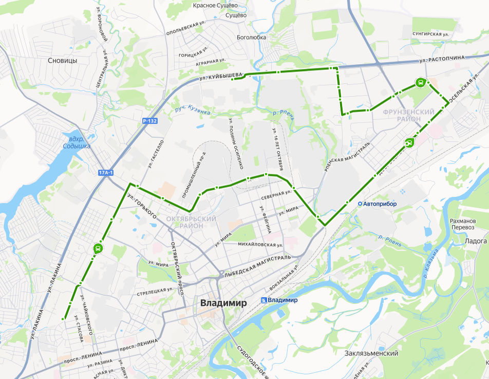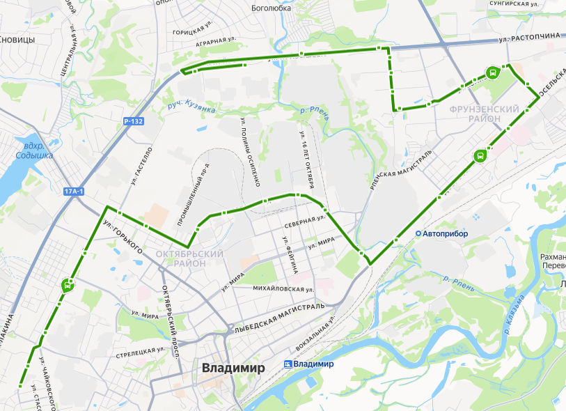 ТК ТАНДЕМ → Комбинат Тепличный → ул. Куйбышева → поворот на ул. Куйбышева → Магазин Ополье → Универсам → ул. Безыменского → ул. Радищева → Добросельский парк → Универмаг Восток → ул. Комиссарова → ул. Егорова → Сады на Добросельской → Городская больница 5 → Суздальский проспект → Детская больница → ул. Погодина → Химический завод → Князь-Владимирское кладбище → Почаевская улица → Электрозаводская улица → Рокадная дорога, ПК АБИ → ул. Почаевский Овраг → Юрьевская улица → Мегаторг → Тракторная улица → ул. Белоконской → Марьинка → Педагогический институт → Красноармейская улица → Школа 2 → ул. БАЛАКИРЕВА