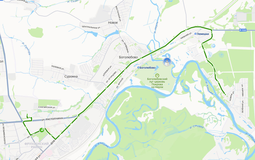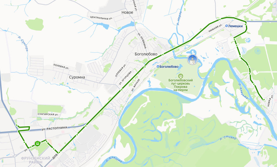 ГИПЕРМАРКЕТ ГЛОБУС → Магазин Турист → Универмаг Восток → ул. Комиссарова → ул. Егорова → поворот на ул. Егорова → Сунгирь → Сунгирь, Сады → Боголюбово, ост. 1 → Церковь Иоакима и Анны → Боголюбово, ост. 3 → Лемешки → Лемешки, поворот на Оргтруд → Оргтрудовские сады, ост. 1 → Сады Лемешки → Оргтрудовские сады, ост. 2 → по требованию → Оргтрудовские сады, ост. 3 → мкр. Оргтруд → мкр. ОРГТРУД, ул. Октябрьская