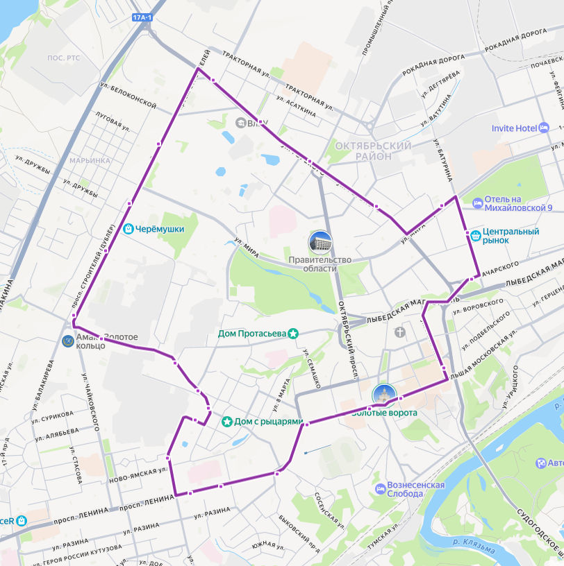 ул. 9 ЯНВАРЯ → Михайловский пруд → ул. Казарменная → Левитановский сквер → ул. Пичугина → пл. Садовая → Студёная Гора → Золотые Ворота → ул. Спасская → ул. Гагарина → ул. Луначарского → Центральный рынок → ул. Мира → Всполье → пл. Ленина → Владимирский государственный университет → ул. Гастелло → ул. Белоконской → Марьинка → Педагогический институт → ул. Красноармейская → Школа 16 → Военная поликлиника → пер. Помпецкий → ул. 9 ЯНВАРЯ