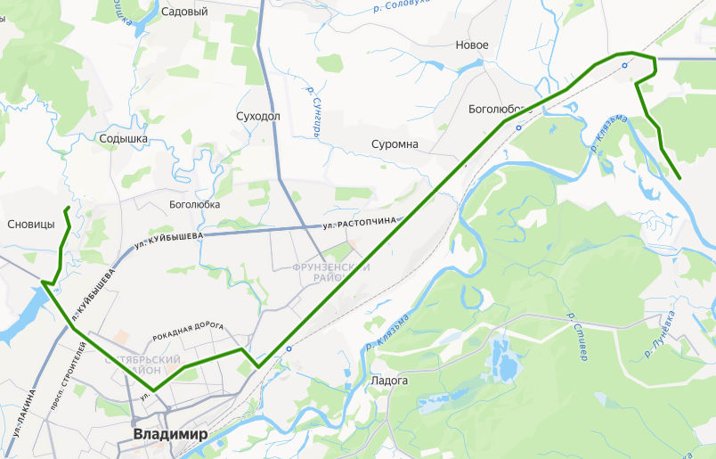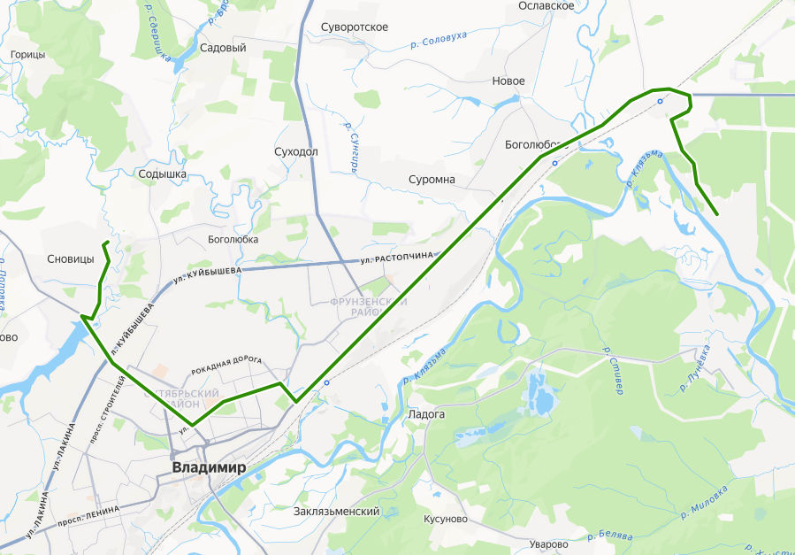 мкр. ОРГТРУД, ул. Октябрьская → Оргтруд → Оргтрудовские сады, ост. 3 → по требованию → Оргтрудовские сады, ост. 2 → Сады Лемешки → Оргтрудовские сады, ост. 1 → Лемешки, поворот на Оргтруд → Боголюбово, ост. 3 → Церковь Иоакима и Анны → Боголюбово, ост. 1 → Сунгирь, Сады → Сунгирь → Театр Разгуляй → Сады на Добросельской → Городская больница 5 → пр-т Суздальский → Детская больница → ул. Дмитрия Погодина → Владимирский химический завод → Князь-Владимирское кладбище → Плавательный бассейн → Дом культуры молодежи → ул. Полины Осипенко → Рынок Ополье → ул. Мира → Всполье → пл. Ленина → Владимирский государственный университет → ул. Гастелло → Река Содышка → Сады Электроприбор → Сновицы, ост. 1 → Сновицы, ост. 2 → Сновицы, ост. 3 → СНОВИЦЫ, Дом культуры
