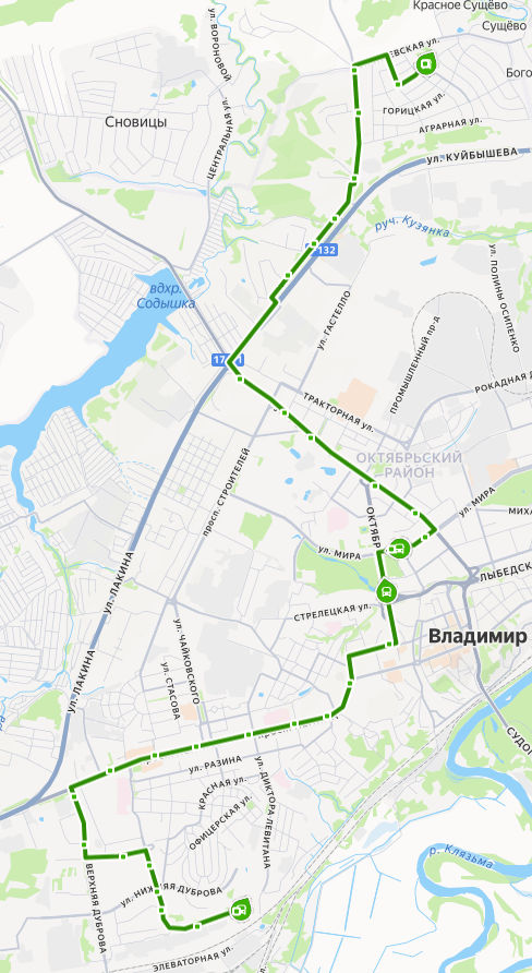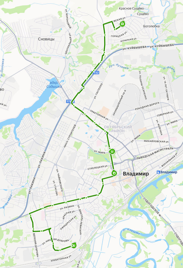 мкр. ПОЛЯНКА → ул. Фалалеевская → поворот на Сущёво → ул. Новгородская → ул. Опольевская → поворот на Содышку → ул. Смоленская → Веризино → Река Содышка → ул. Гостелло → Владимирский государственный университет → пл. Ленина → Всполье → Музей природы → пр-т Октябрьский → Строительный колледж → Студёная Гора → пл. Садовая → ул. Пичугина → Левитановский сквер → пл. Победы → ул. Пугачева → пр-т Ленина → ул. Верхняя Дуброва → Парк Дружба → ул. Василисина → ул. Пугачева, д. 62 → ул. Тихонравова → Финансовый университет → Детский сад 12 → ЮГО-ЗАПАДНАЯ