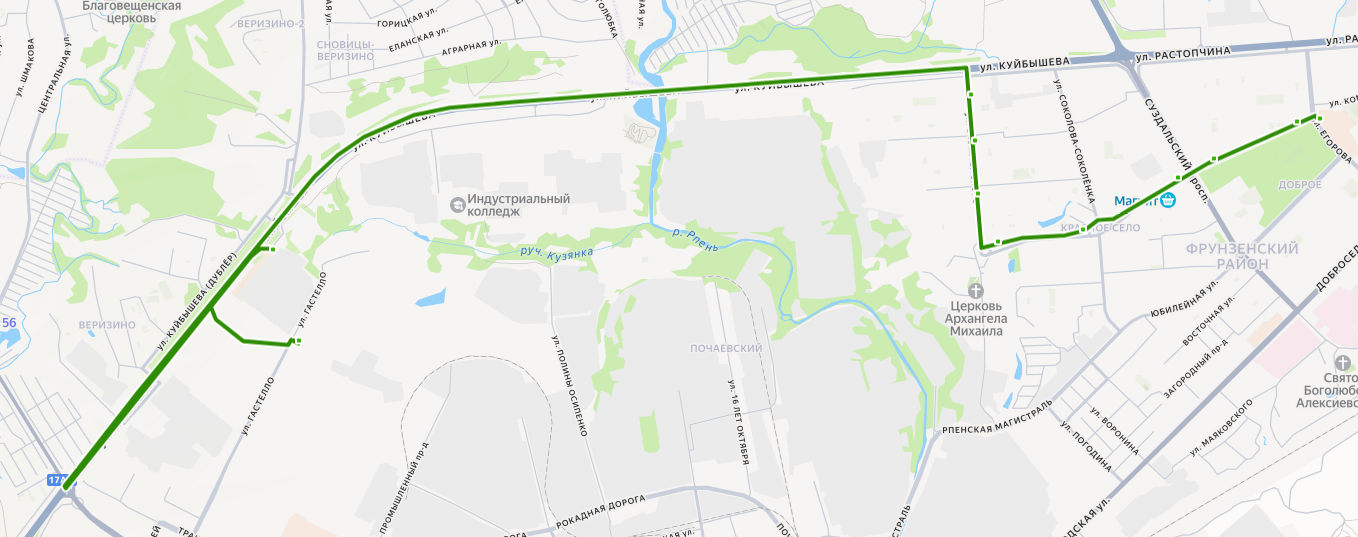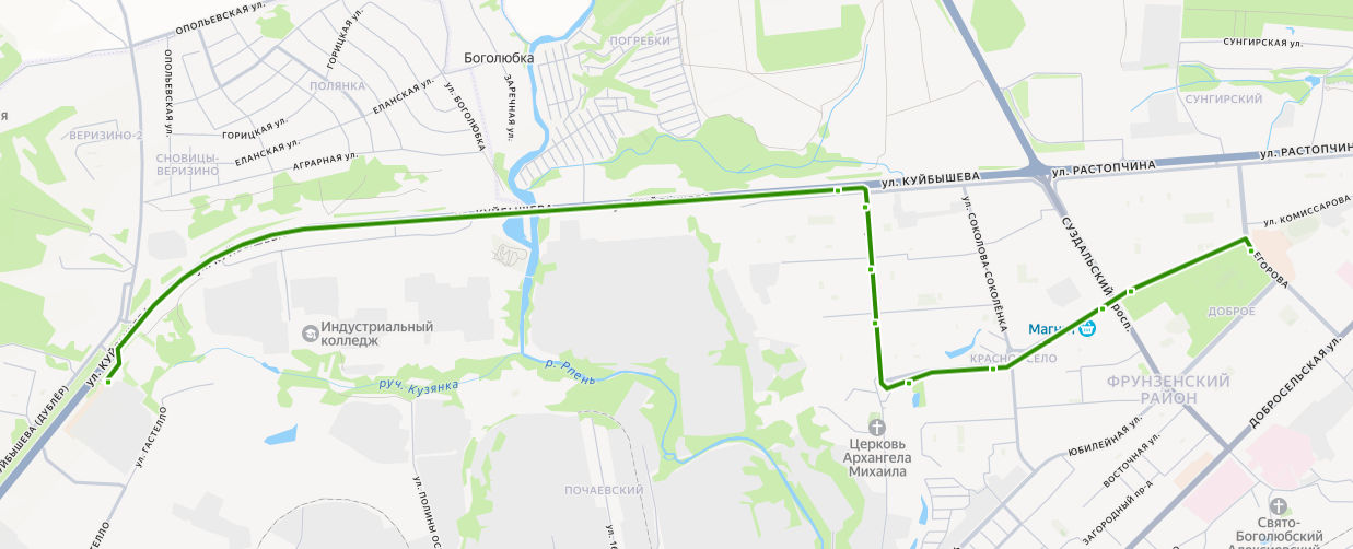 ТК ИВАНОВСКИЕ МАНУФАКТУРЫ → ул. Куйбышева → поворот на ул. Куйбышева → Магазин Ополье → Универсам → ул. Безыменского → ул. Радищева → Добросельский парк → Универмаг Восток → ул. КОМИССАРОВА