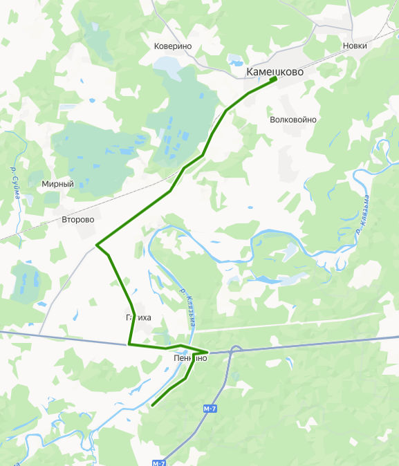 КАМЕШКОВО, Автостанция → Берково → Тереховицы, ост. 2 → Тереховицы, ост. 1 → Высоково → Городок, ост. 2 → Городок, ост. 1 → поворот на Гатиху → Курменево → Юрятино → поворот на Андрейцево → ул. Рабочая → Гатиха → поворот на Камешково → Гаврильцево → поворот на Пенкино → Пенкино → Краснораменье → САНАТОРИЙ ЛЕНИНА