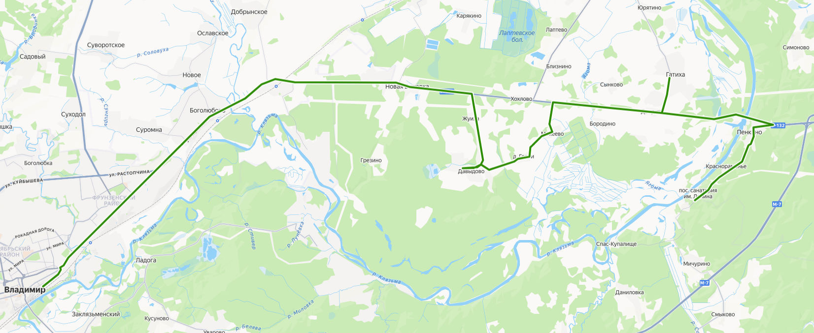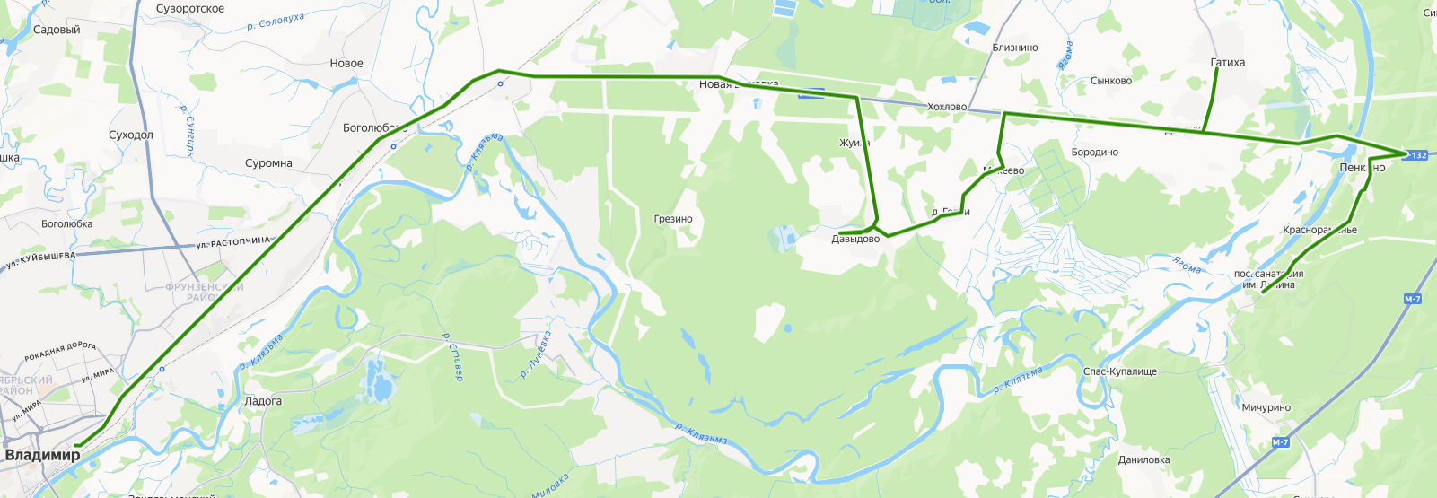 ВЛАДИМИР, Автовокзал → Владимирский химический завод → Детская больница → поворот на ул. Егорова → Боголюбово, ост. 1 → Церковь Иоакима и Анны → Боголюбово, ост. 3 → Лемешки → пос. Лесной → Новая Быковка → поворот на Давыдово → Жуиха → Аксенцево → Новское → Давыдово → Новское → Горки → Ворынино → Давыдово → Бородино → Дворики → поворот на Камешково → Гатиха → поворот на Камешково → Гаврильцево → поворот на Пенкино → Пенкино → Краснораменье → САНАТОРИЙ ЛЕНИНА