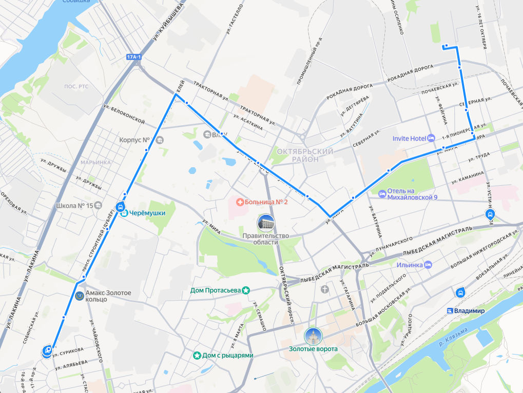 ул. БАЛАКИРЕВА → Школа 2 → ул. Красноармейская → Педагогический институт → Марьинка → ул. Белоконской → ул. Гастелло → Владимирский государственный университет → пл. Ленина → Всполье → Центральный парк → ул. Полины Осипенко → Дом культуры молодежи → ул. Каманина → Владимирский юридический институт → Молодежный сквер → ул. Железнодорожная → пл. ВОКЗАЛЬНАЯ