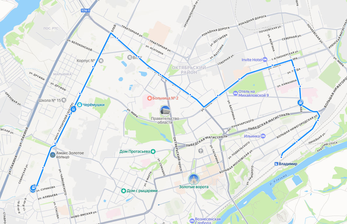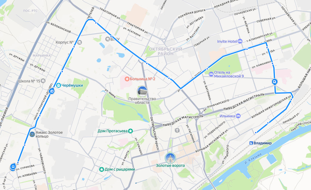 ВЭМЗ → Электрозаводская улица → Северная улица → Дом культуры молодежи → ул. Полины Осипенко → Рынок Ополье → ул. Мира → Всполье → площадь Ленина → Владимирский государственный университет → ул. Гастелло → ул. Белоконской → Марьинка → Педагогический институт → Красноармейская улица → Школа 2 → ул. БАЛАКИРЕВА