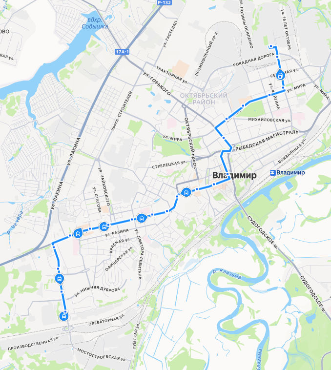 ул. ФАТЬЯНОВА → Рынок Слобода → Парк Дружба → ул. Верхняя Дуброва → пр-т Ленина → ул. Пугачева → пл. Победы → Левитановский сквер → ул. Пичугина → пл. Садовая → Студёная Гора → Золотые Ворота → ул. Спасская → ул. Гагарина → ул. Луначарского → Центральный рынок → Центральный парк → ул. Полины Осипенко → Дом культуры молодежи → ул. Северная → ВЭМЗ