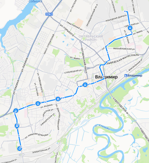 ВЭМЗ → Электрозаводская улица → Северная улица → Дом культуры молодежи → ул. Осипенко → Рынок Ополье → ул. Мира → Юрьевская застава → ул. Гагарина → Спасская улица → Золотые Ворота → Студёная Гора → Садовая площадь → ул. Пичугина → Левитановский сквер → площадь Победы → ул. Пугачева → проспект Ленина → ул. Верхняя Дуброва → Парк Дружба → Рынок Слобода → ул. ФАТЬЯНОВА